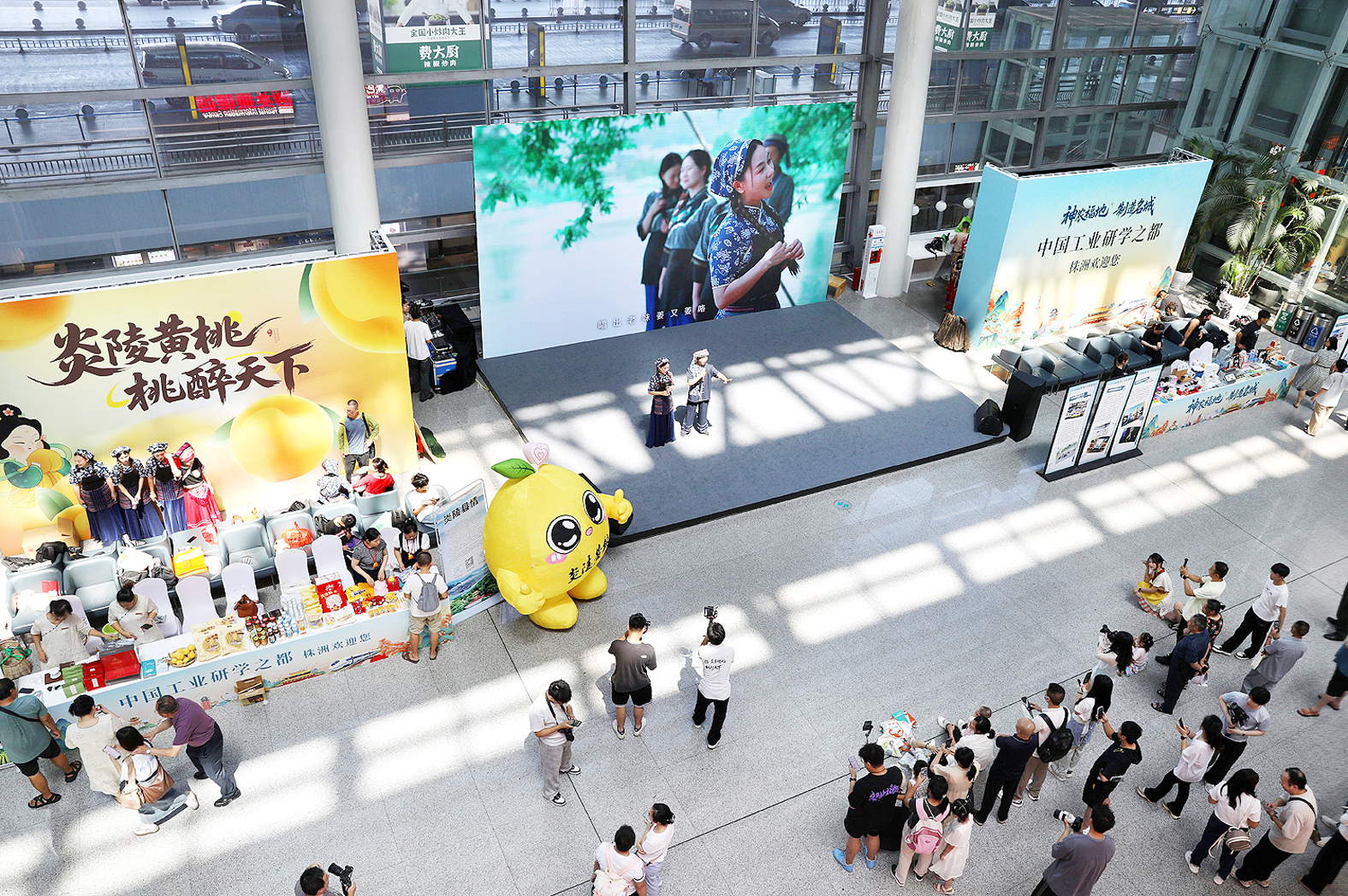 《炎帝颂》《国彩醴陵》《思情鬼歌》……活动现场,一个个极具株洲地域特色的歌舞节目,留住了旅客的脚步,赢得了阵阵掌声。株洲街头艺术站的表演者们则用现代艺术形式演绎传统文化,让现场观众耳目一新。在炎陵县特产展区,黄灿灿的炎陵黄桃与清香怡人的炎陵茶叶成为关注的焦点。
