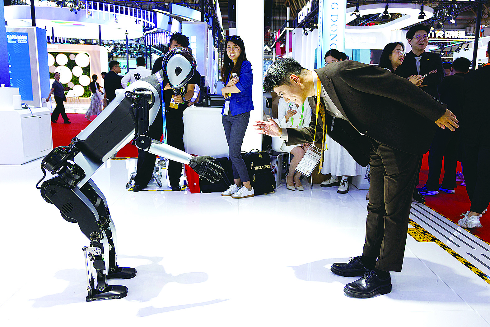 7月17日,在第三届中国国际供应链促进博览会主宾省广东省展台,商用版人形机器人“行者”和一位媒体记者互致问候。 第三届中国国际供应链促进博览会上,泰国担任主宾国,山东、广东担任主宾省。 新华社记者 金立旺 摄