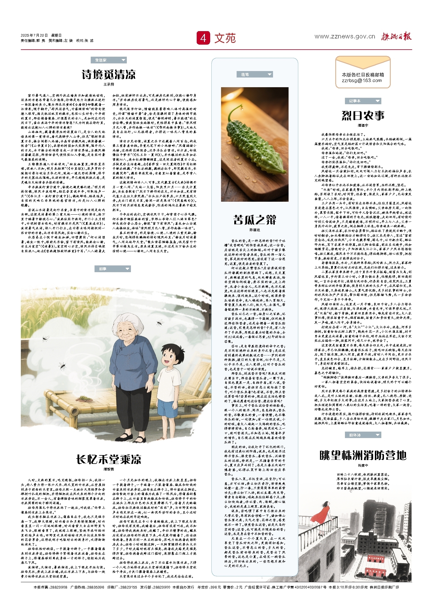 祖母用湿毛巾将凉床抹了一遍后,对我说:“你带上蒲扇到凉床上去乘凉。”