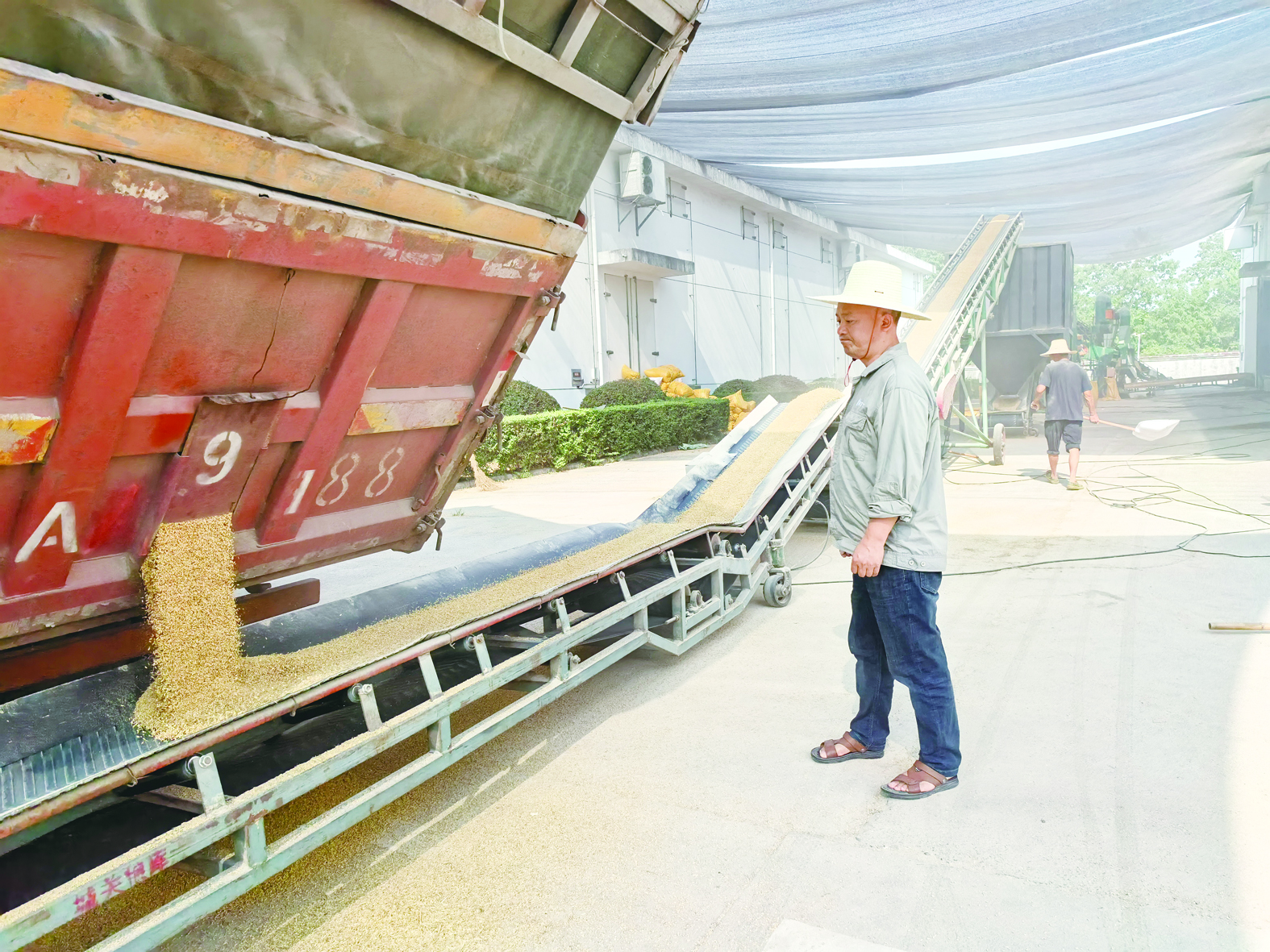 看着自己种的粮食被倾倒在传送带上,除杂后源源不断送进粮仓,罗广明悬着的心总算放了下来。他走进粮库提供的空调休息室,这里凉茶、防暑药品等一应俱全,等候的粮农互相打听收成,罗广明也加入其中。
