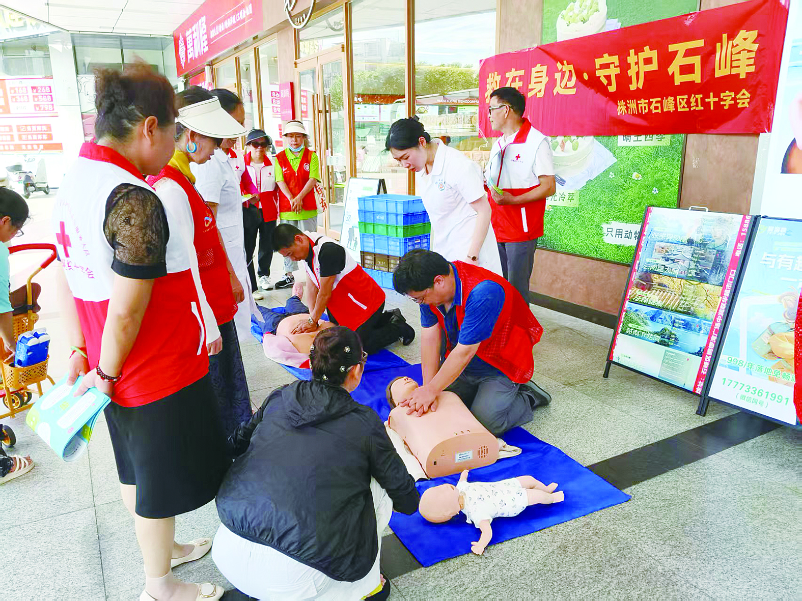 石峰区新阶联在响石广场开展“三百三助”百名志愿者助基层活动,图为应急救护培训现场。记者/杨如 摄