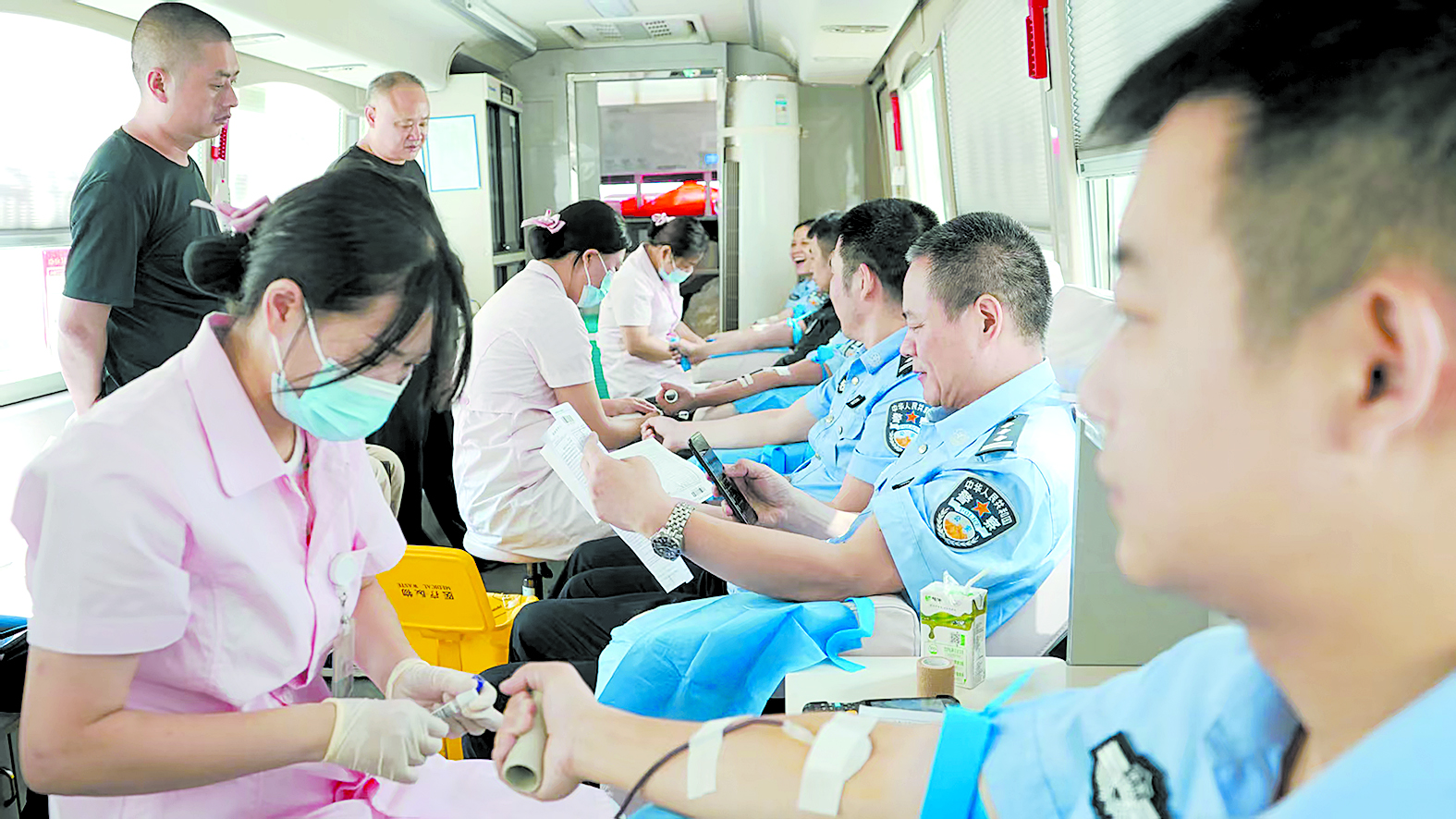 7月24日,市公安局前坪,民警们早已整齐列队,等待着献血车的到来。“作为人民警察,守护人民群 众生命健康是我们义不容辞的职责。希望能通过献血这种方式,为急需血液救治的患者送去生的希望。” 一名参与献血的民警质朴的话语,道出了在场所有献血者的心声。