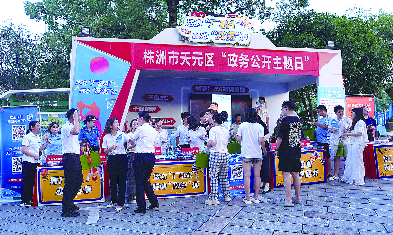 当天夜里,由天元区数据局、区政务服务中心联合区委巡察办、区人社局、区医保局、区市监局、区城管局等部门开展的“政务夜市”活动,吸引众多市民前来咨询。“我们定制的天元数政卡通钥匙扣、‘湘易办’推广码围裙、生育一件事‘大礼包’等小礼品收获群众好评。”文依霏说。