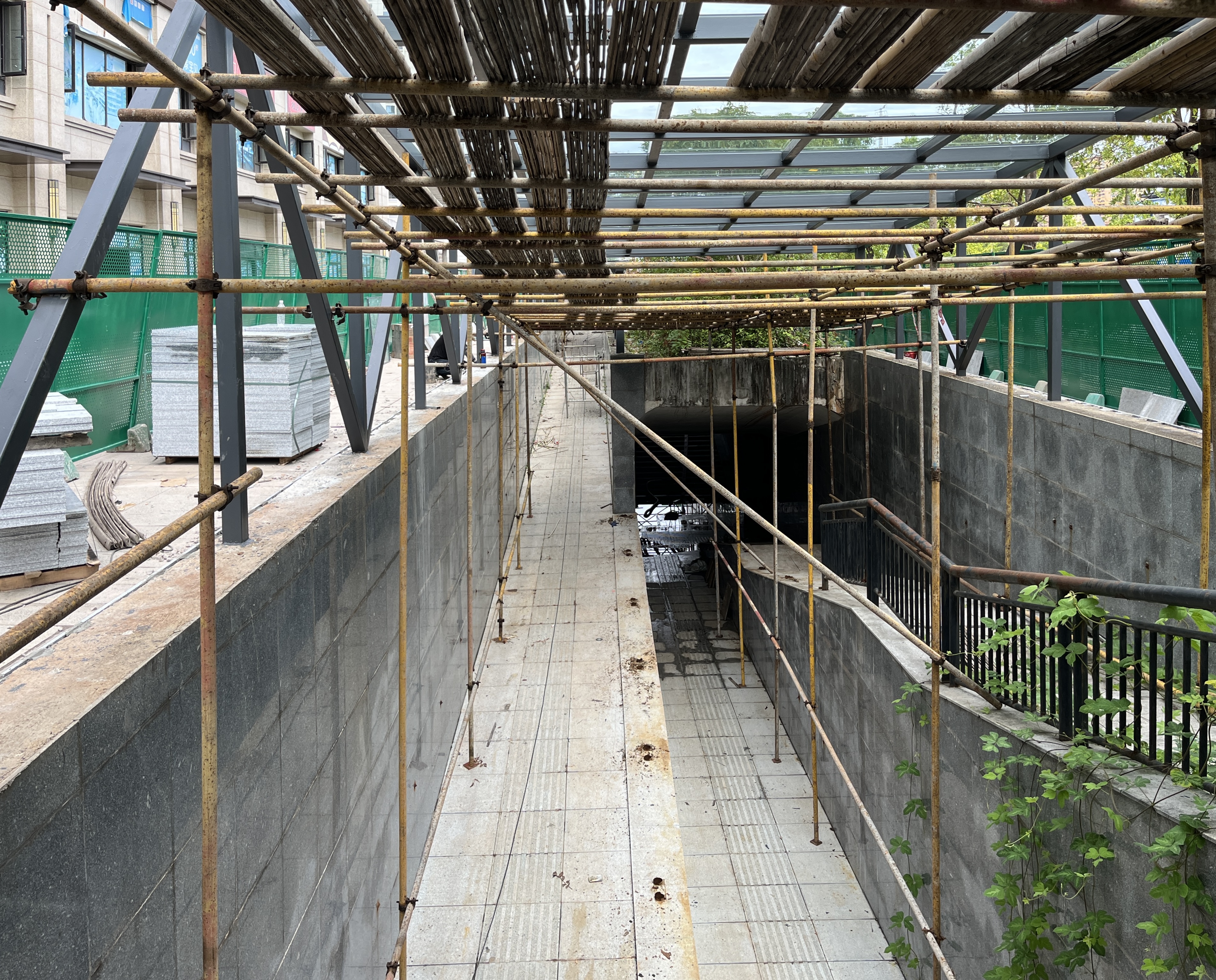 今年7月23日,记者核实发现,地下通道出入口区域已被施工围挡围住。位于出入口处的钢架棚,重新刷了油漆,焕然一新;棚顶更换了崭新的钢化玻璃;通道内的积水、杂草、垃圾等已经清除,地面整洁。