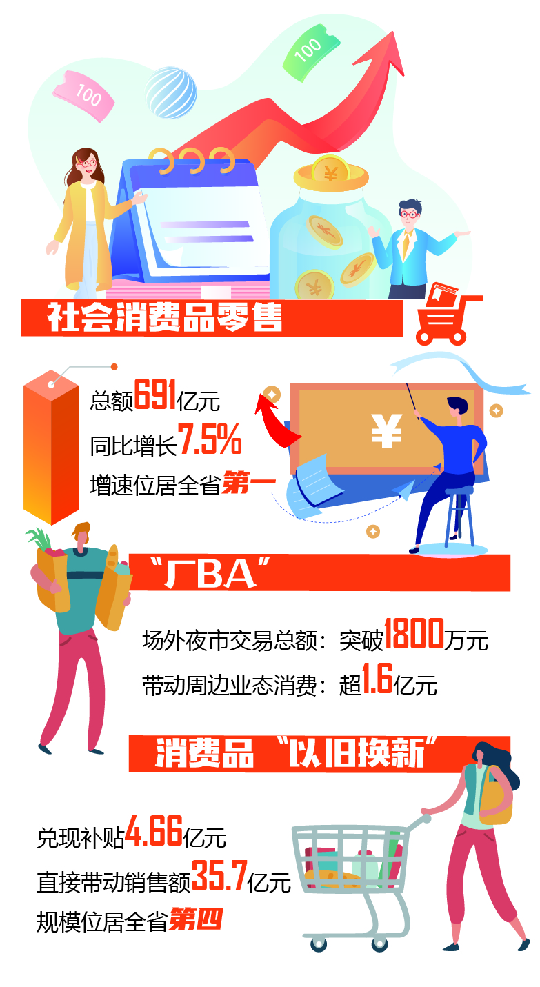 此外,我市大力推进消费品“以旧换新”,推出“消费贷”“国补贷”等专属金融产品,开展汽车、3C数码、家电等补贴活动。截至目前,全市累计成交44.7万笔,兑现补贴4.66亿元,直接带动销售额35.7亿元,规模位居全省第四。