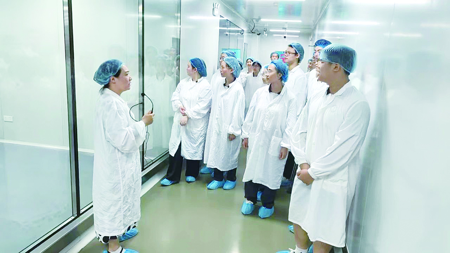 透过观察窗,学子们看到车间里高度自动化的生产线如精密的交响乐团般有序运作,无菌环境的严苛标准令学子屏息凝神。智能化设备高速精准完成分装、检测、赋码,现代工业的“智造”魅力震撼人心,课本上的“自动化”“无菌控制”在一中学子眼前得以具象化。