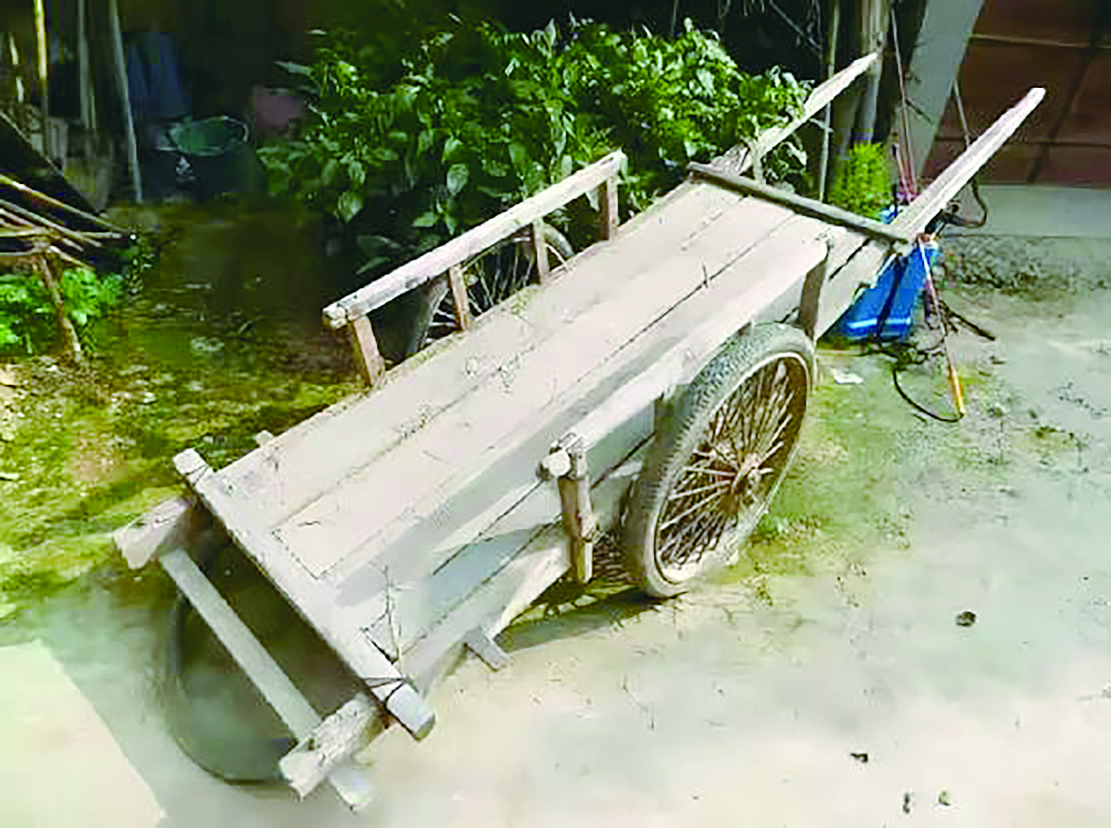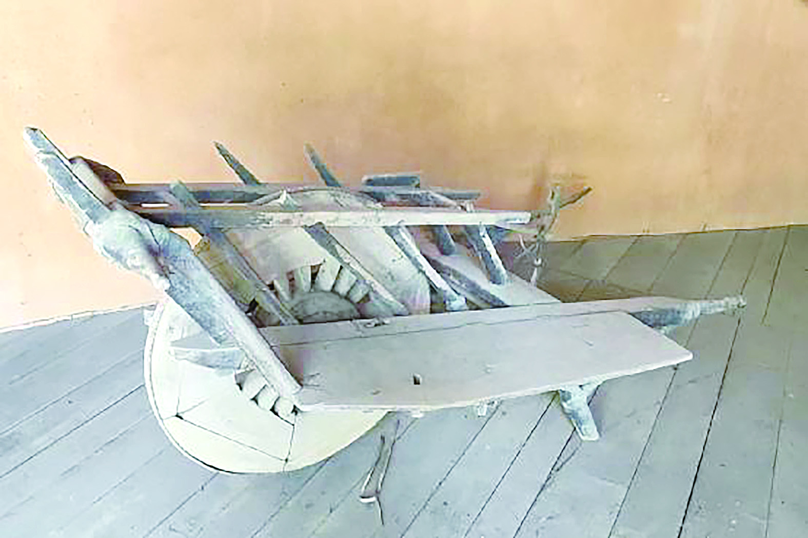 第二种叫“高车”,顾名思义,比“土车子”高、大、上,独轮直径有0.7米,也是铁箍硬木轮子,但不是实心,其轮芯由木质辐条呈放射状排列、镂空构成,既减轻了重量又显出美观。独轮盘两侧配置栏杆,各铺一块宽0.33米、长0.85米的整块厚木板做车厢板,前头斜装一块等宽的挡板,既可运货,又可载人。昔日家境较好的妇女回娘家或逛街市便坐此车。一侧坐人,一侧放包袱行李,这在当年,是很体面的出行。