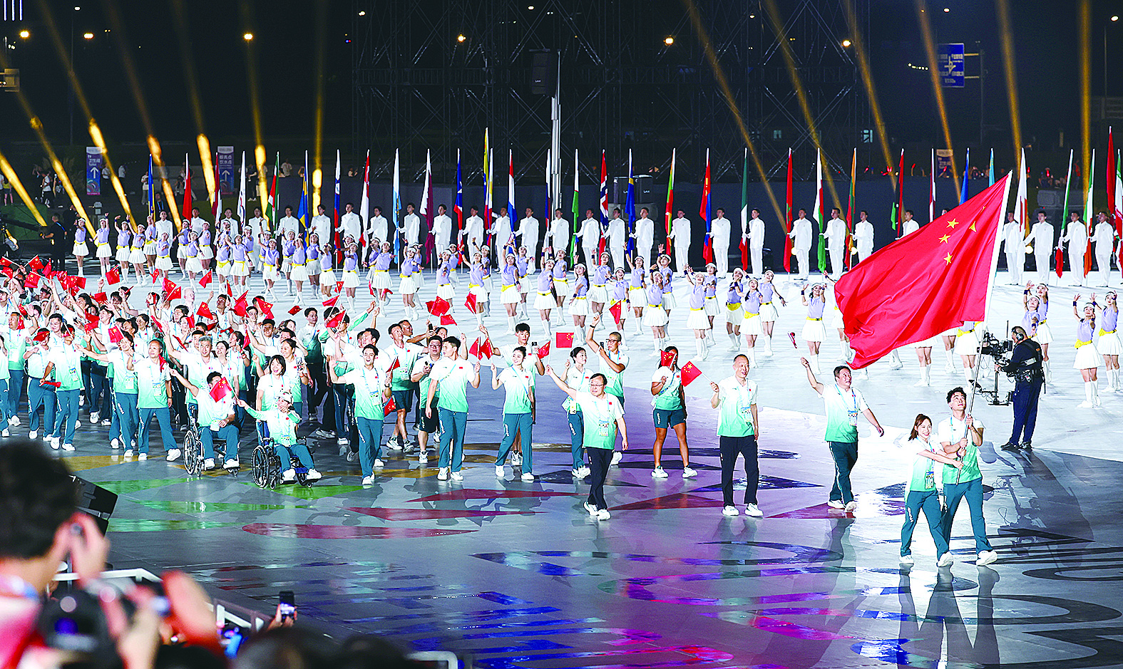 8月7日,中国体育代表团在开幕式上入场。 当日,第12届世界运动会开幕式在成都举行。 新华社记者 姜克红 摄