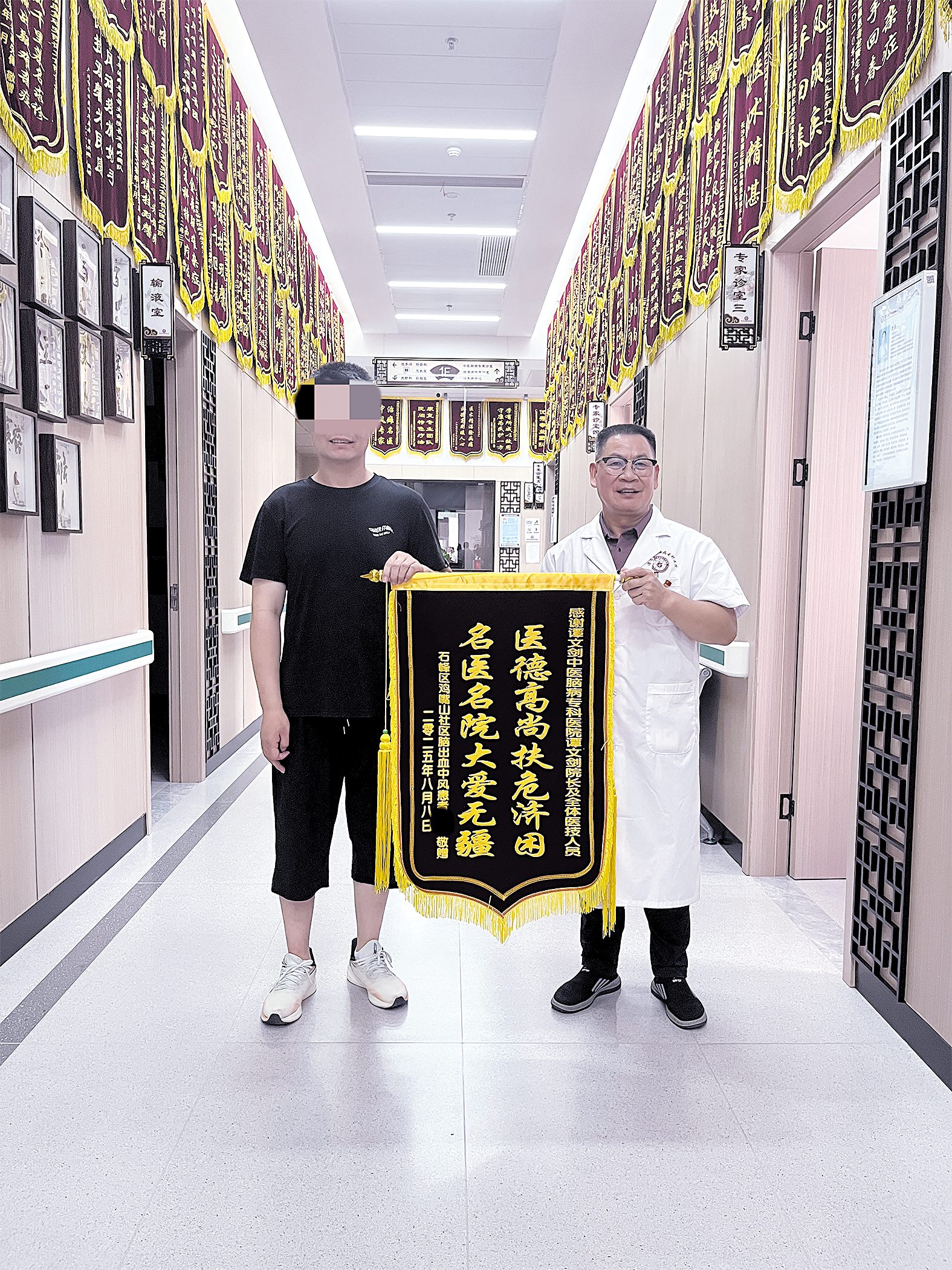 今年6月,谭文剑中医脑病专科医院正式开诊,开诊当天开展了公益活动,为10名患者提供免费治疗。经社区居委会推荐,郭康参加了这项活动,接受免费治疗。经过一个多月时间的治疗,恢复效果明显。图为郭康向谭文剑赠送锦旗。株洲日报全媒体记者/刘平 摄