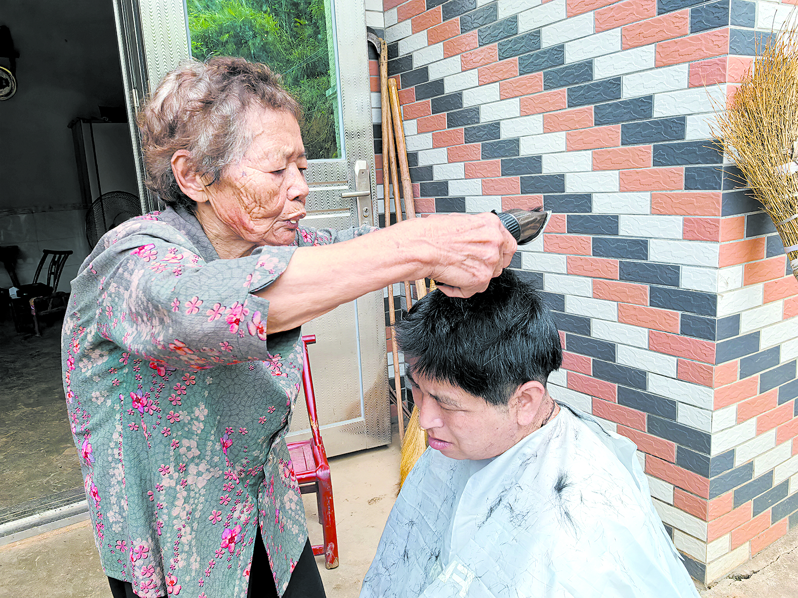 唐雪梅帮儿媳金妹理发。记者/赖杰琦 摄