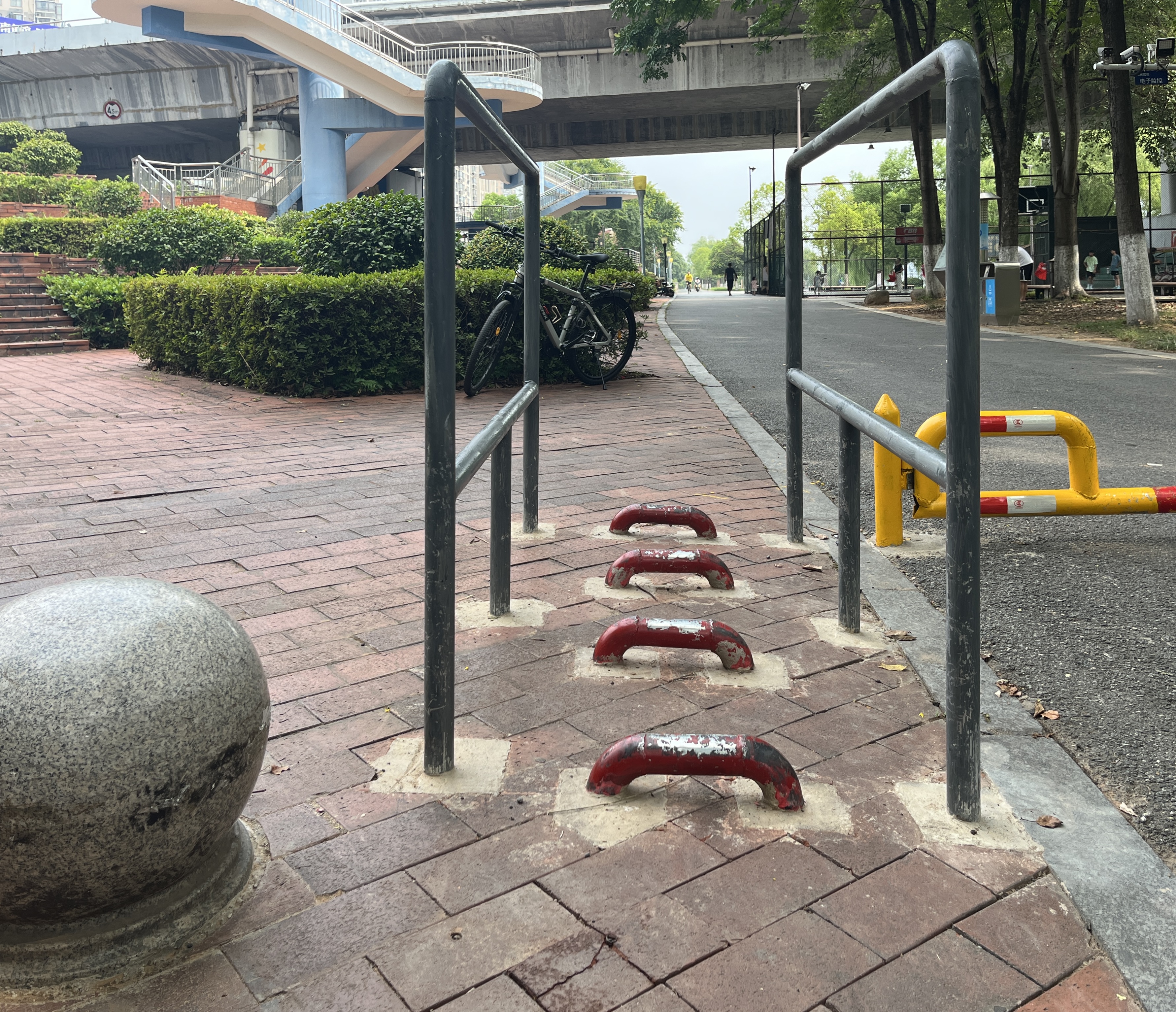 无障碍通道上设有金属条状物,防止电动车、摩托车通行。记者/刘平 摄