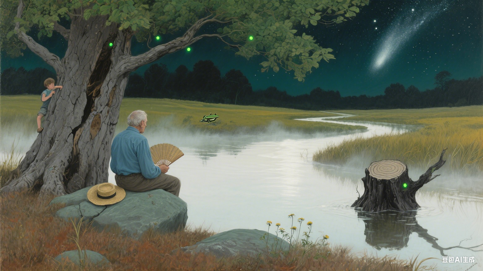 太阳刚沉下西山,余热仍在蒸腾。溪面浮起一层薄雾,丝丝凉意从水边渗出,浸润着空气。树下那块被岁月磨得光亮的大石头,早已坐满了人。蒲扇轻摇,噗哒、噗哒,是夏夜唯一的节奏。