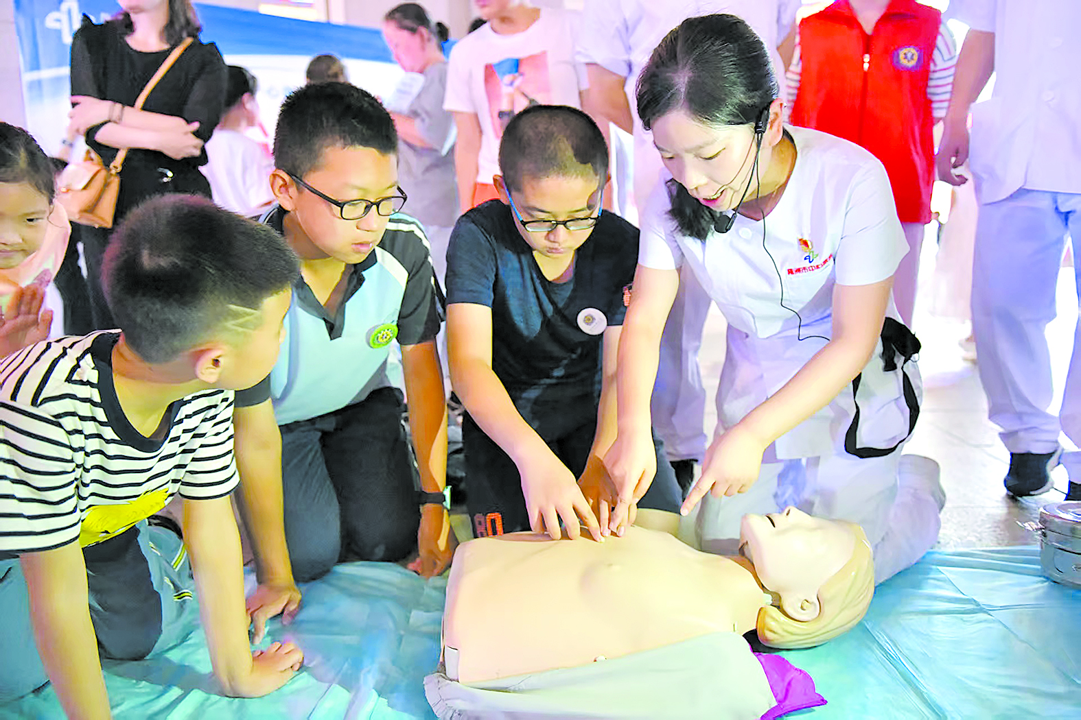◀吴敏在神农广场做第一目击者培训。 受访者/提供