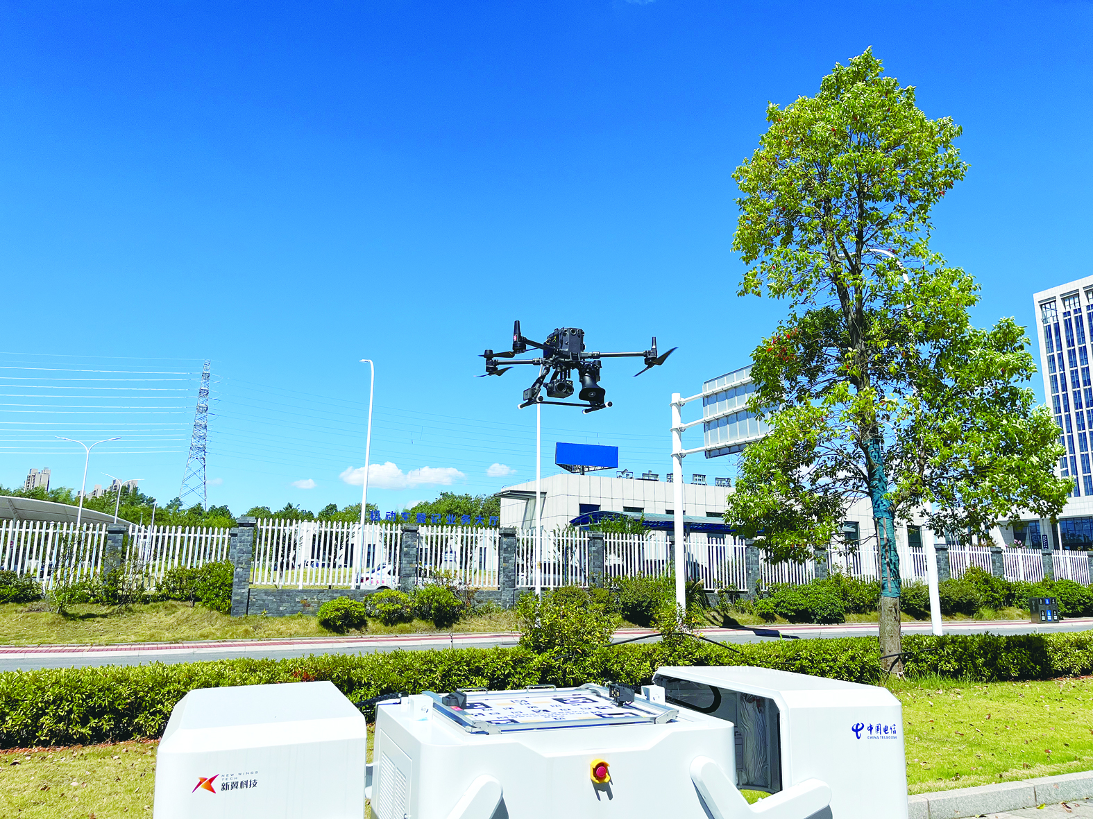 按下按钮,几公里外的机巢自动打开盖子,一架携带着摄像头和喊话器的无人机快速升空,开始了空中巡检工作,巡检画面同步呈现在大屏幕上。巡检完毕后,无人机又自动飞回机巢。这是记者8月19日在湖南新翼智能科技发展有限公司(以下简称“新翼科技”)看到的一幕。