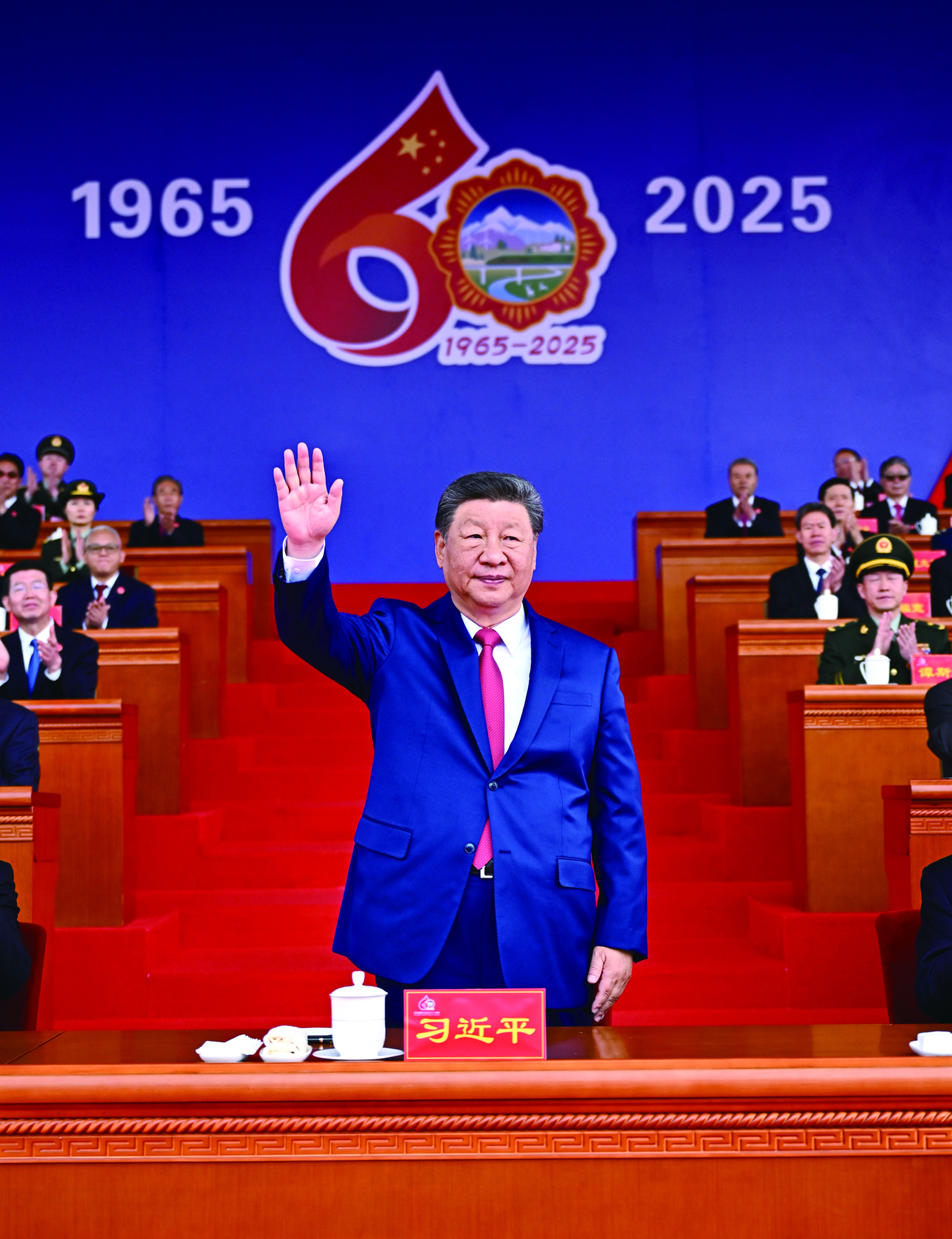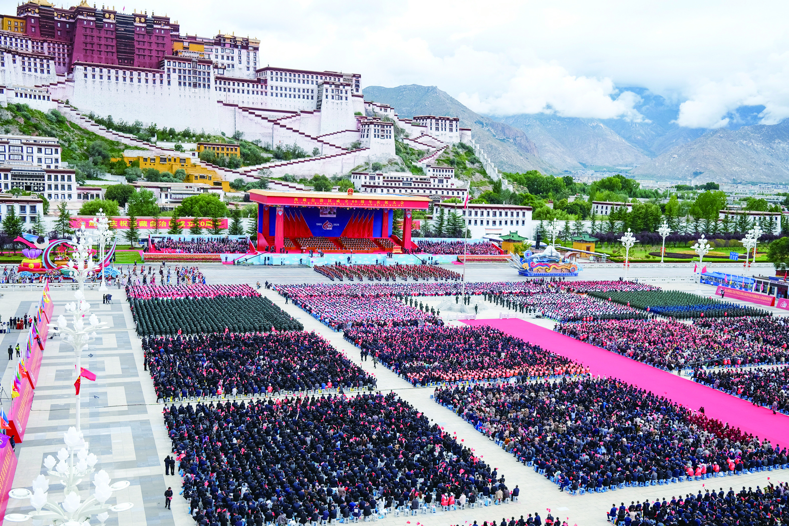 古城拉萨彩旗飘扬,处处洋溢着节日的氛围。雄伟的布达拉宫下,搭建起藏式风格的大会主席台。主席台上方中华人民共和国国徽和“西藏自治区成立60周年庆祝大会”横幅十分醒目,背景墙上悬挂着大庆会徽和“1965”“2025”字样,10面红旗分列两侧。主席台对面的布达拉宫广场上,身着节日盛装的各族群众从四面八方汇聚到这里,手中挥动着红旗,汇聚成一片欢乐的海洋。