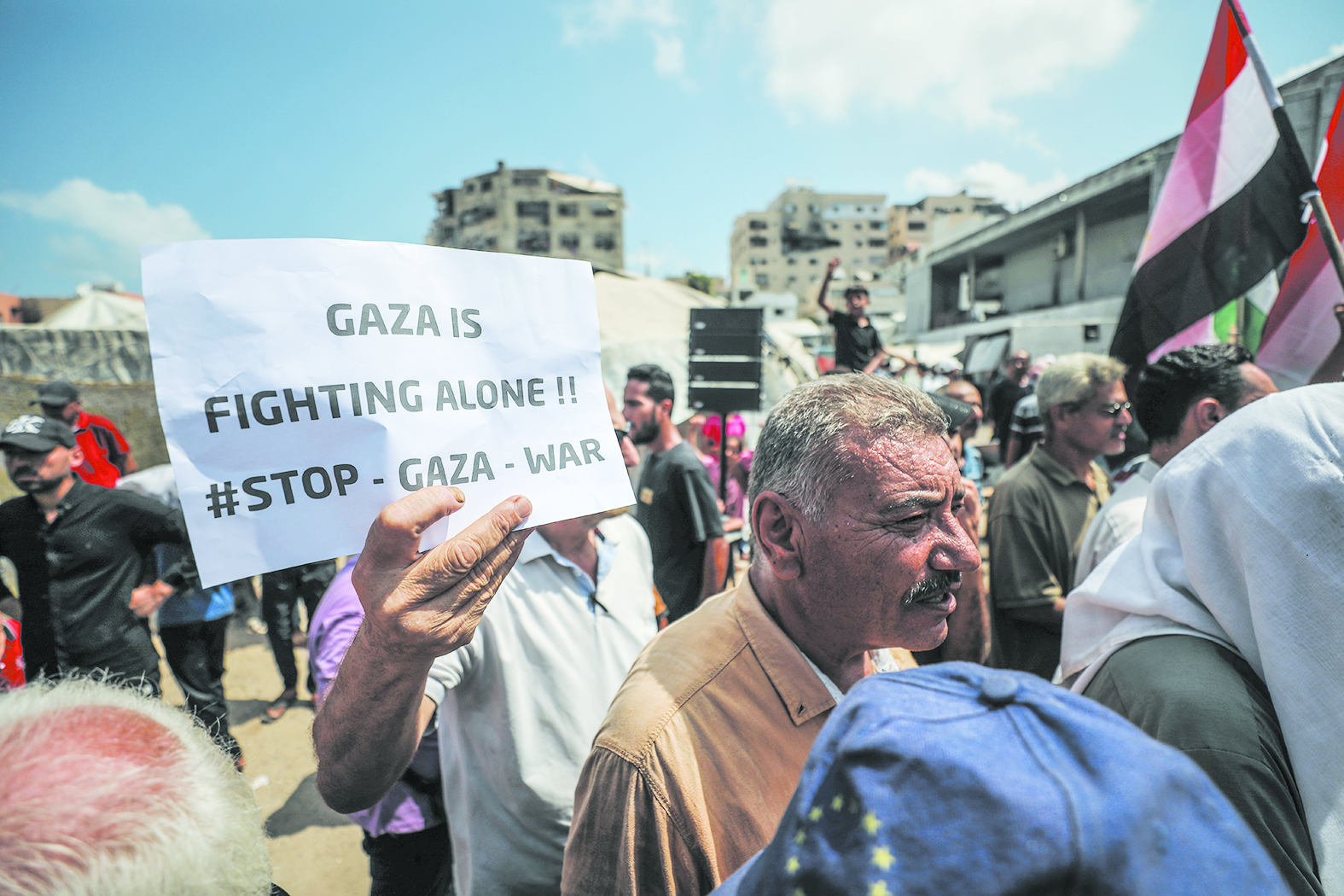 8月21日,数百名巴勒斯坦人聚集在加沙城的市中心,要求以色列停止战争和驱逐平民,呼吁国际社会保护加沙平民。