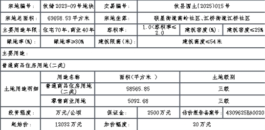 攸储2023-09号地块:(一)规划建设要求:严格按照攸县自然资源局批准的规划条件《关于攸储2023-09号地块的规划条件》(攸自然资条〔2025〕12号)进行建设。(二)成交价款缴纳期限:余款在成交之日起60日内交齐,逾期则严格按照《土地出让金管理办法》规定依法收缴违约金。(三)宗地移交条件:宗地由土地储备中心按现状移交。①交地、腾地中涉及的有关村组矛盾纠纷由土地储备中心商联星街道办事处与江桥街道办事处负责解决。②宗地红线范围内的土地由征地协调服务中心依法征拆补偿到位。③宗地红线范围内的土地平整及相关建设由竞得人自行负责。(四)成交价款缴纳期限:成交之日起60日内交齐;交地时间:交齐价款后60日内交地;动工时间:交地之日起60日内动工;竣工时间:动工之日起两年内竣工。(五)竞买人范围为:中华人民共和国境内外的法人和其他组织。