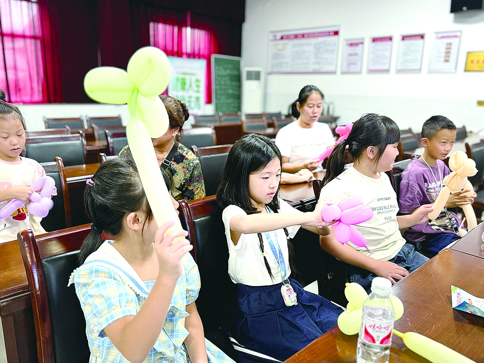 长条气球在孩子手中翻飞,不一会儿,一只可爱的小狗或一朵灿烂的花儿便“诞生”了。在魔术气球手工课上,志愿者从基础操作教起,孩子们紧跟步骤、大胆尝试,家长也在旁鼓励助阵。