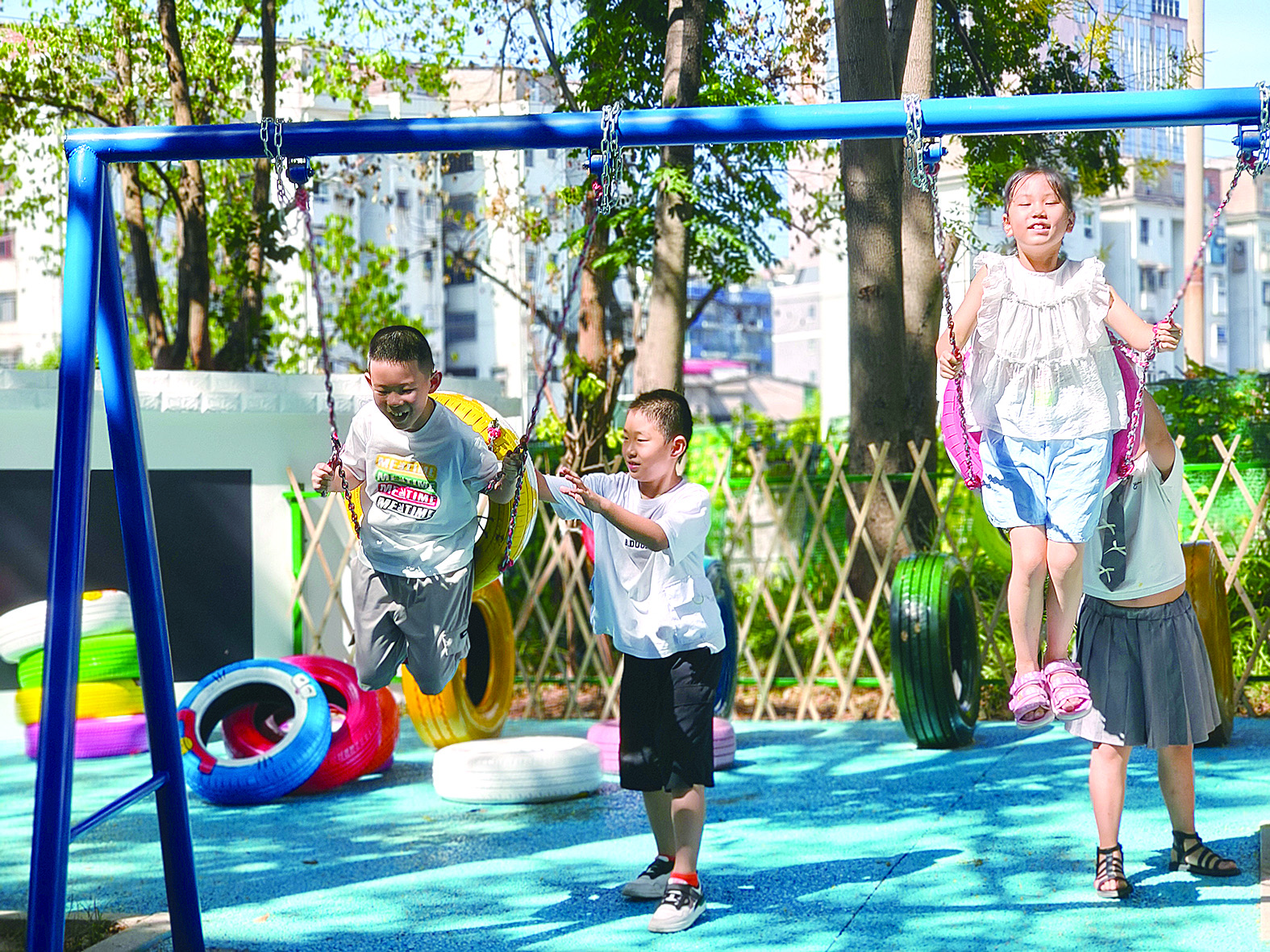 天元区银海学校暑假里进行微改造,轮胎秋千“飞”起来。 受访单位供图