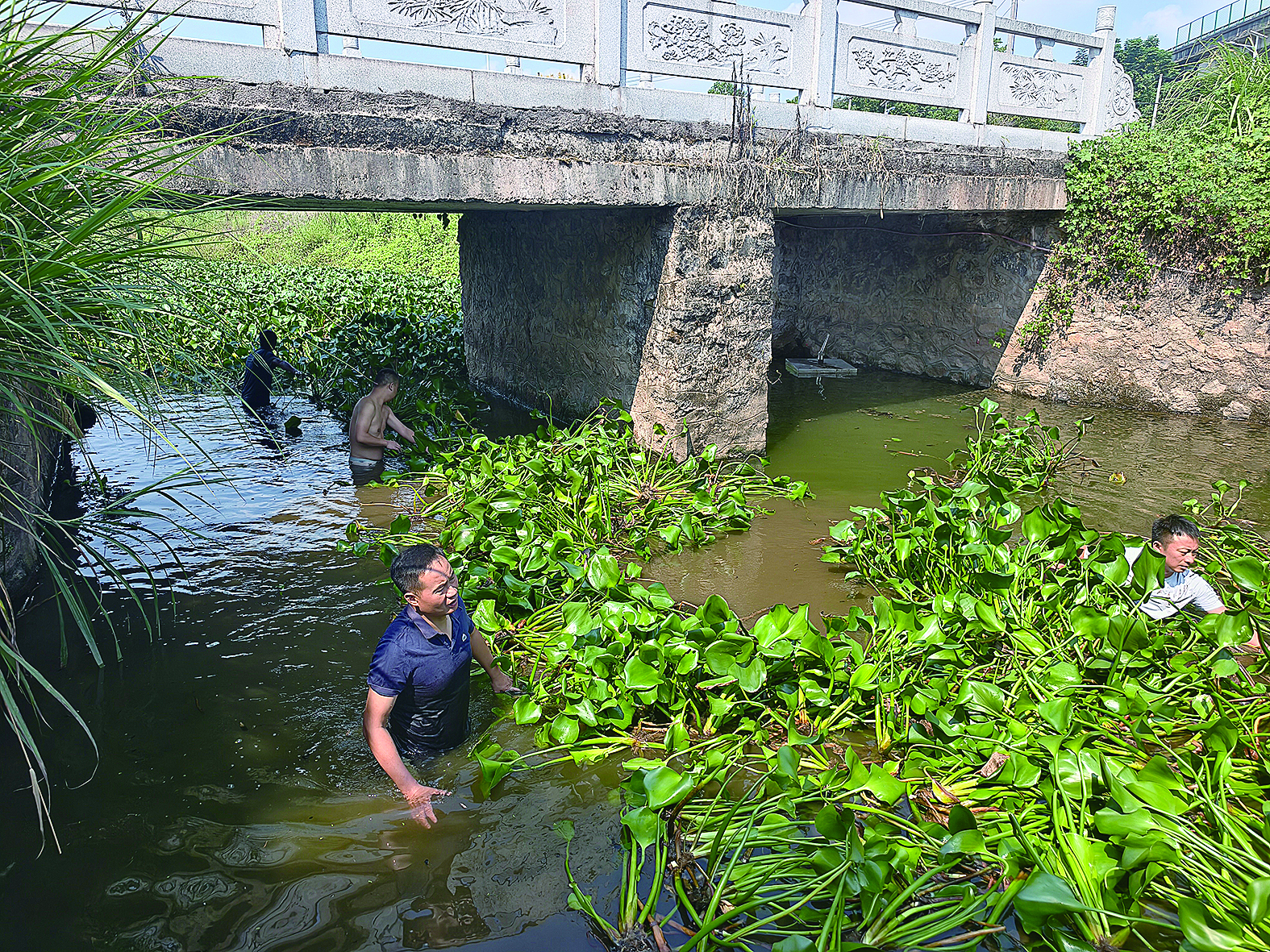 党员、群众齐心协力在水中清理水葫芦。通讯员 供图