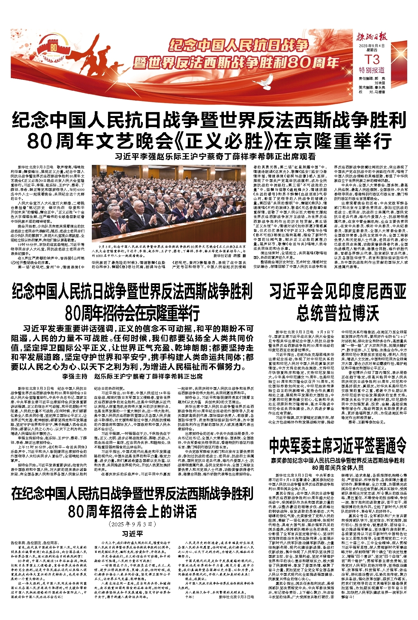 今天上午,我们举行盛大阅兵仪式,隆重纪念中国人民抗日战争暨世界反法西斯战争胜利80周年,目的是铭记历史、缅怀先烈、珍爱和平、开创未来。