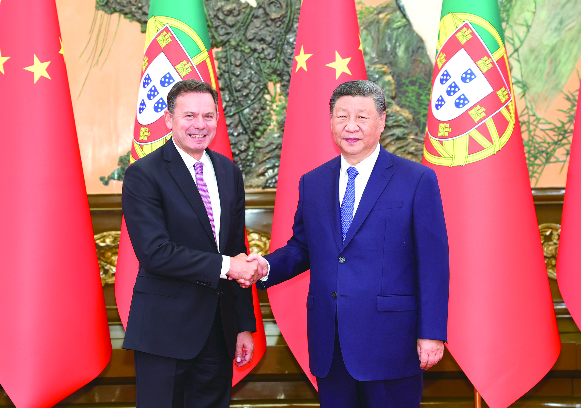 习近平指出,中国和葡萄牙都是历史底蕴深厚的国家,两国人民都拥有开放包容、进取自主的精神特质。双方通过友好协商妥善解决了澳门问题。近年来各领域合作取得重要成果,树立了不同社会制度、不同国情国家相互尊重、互利共赢的典范。今年是中葡建立全面战略伙伴关系20周年。中方愿同葡方加强战略沟通,把握双边关系正确方向,让中葡关系好上加好,以团结合作为两国和世界繁荣进步作出更大贡献。双方要赓续传统友好,相互信任、相互支持。深化发展战略对接,拓展创新、绿色、海洋、医药等领域务实合作,发挥澳门独特桥梁作用,用好中国-葡语国家经贸合作论坛等机制,实现更高水平互利共赢。鼓励文化、教育、旅游、科研领域交往,深化人文交流。国际形势越是变乱交织,中欧越要加强沟通、增进互信、深化合作。希望葡方同中方一道,坚持中欧伙伴关系定位,推动中欧关系持续稳定健康发展。