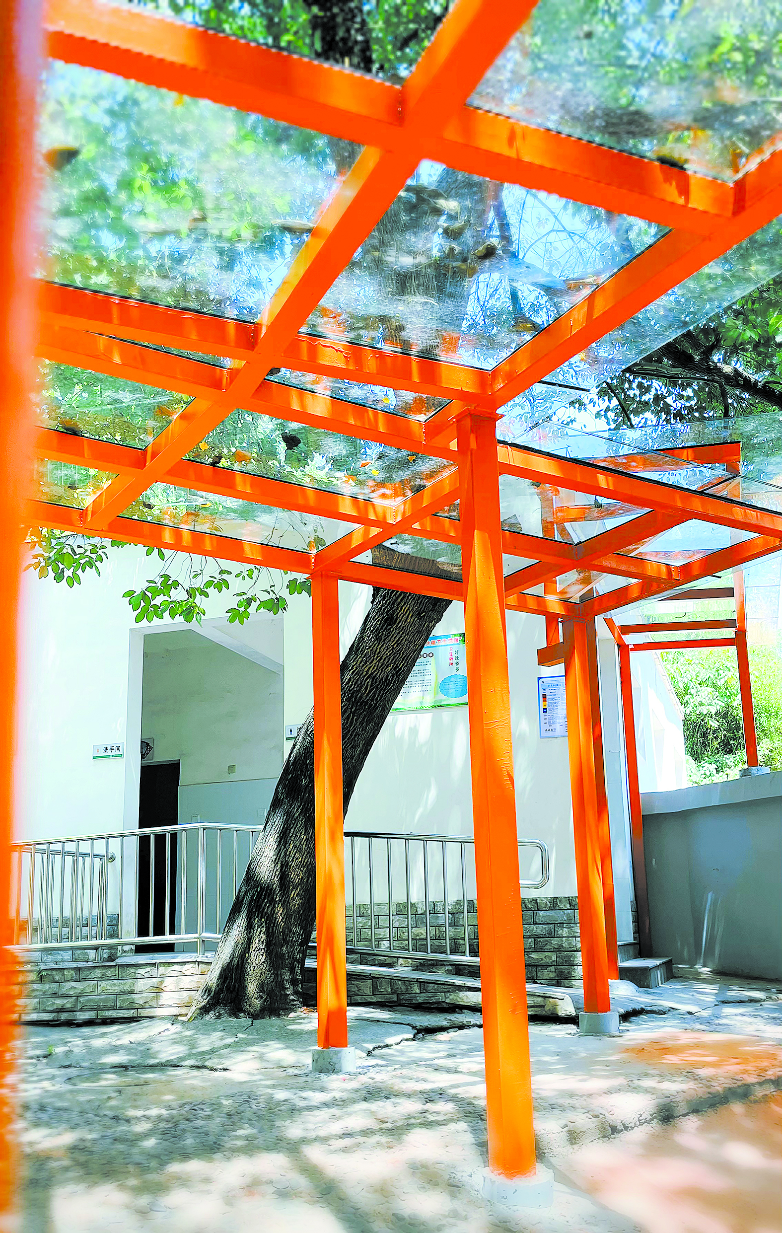 天元区乡村学校砖桥中心小学有了彩色的风雨连廊。 记者/戴凛 摄