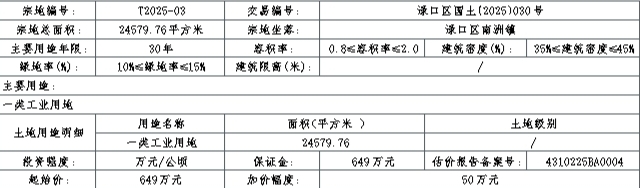 T2025-03:(一)须按照株洲市渌口区自然资源局2025年8月20日出具的《株洲市渌口区规划条件通知书》及蓝线图实施。(二)根据工业用地弹性供地工作要求,该宗地土地出让年限为工业用地30年。(三)竞得人在成交后10个工作日内签订《国有建设用地使用权出让合同》,合同签订之日现状交地。(四)相关用地矛盾由竞得人及南洲镇政府共同协调处理。