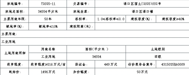 T2025-11:(一)须按照株洲市渌口区自然资源局2025年8月22日出具的《株洲市渌口区规划条件通知书》(编号202508014)及蓝线图实施。(二)该宗地以标准地供地,固定资产投入强度≥216万元/亩、亩均收入≥320万元/亩、亩均税收≥20万元/亩。(三)竞得人在成交后10个工作日内签订《国有建设用地使用权出让合同》,合同签订之日现状交地。出让金自《国有建设用地使用权出让合同》签订之日起1个月内缴清50%,3个月内全部缴清。(四)相关用地矛盾由渌口高新区、竞得人共同协调处理。