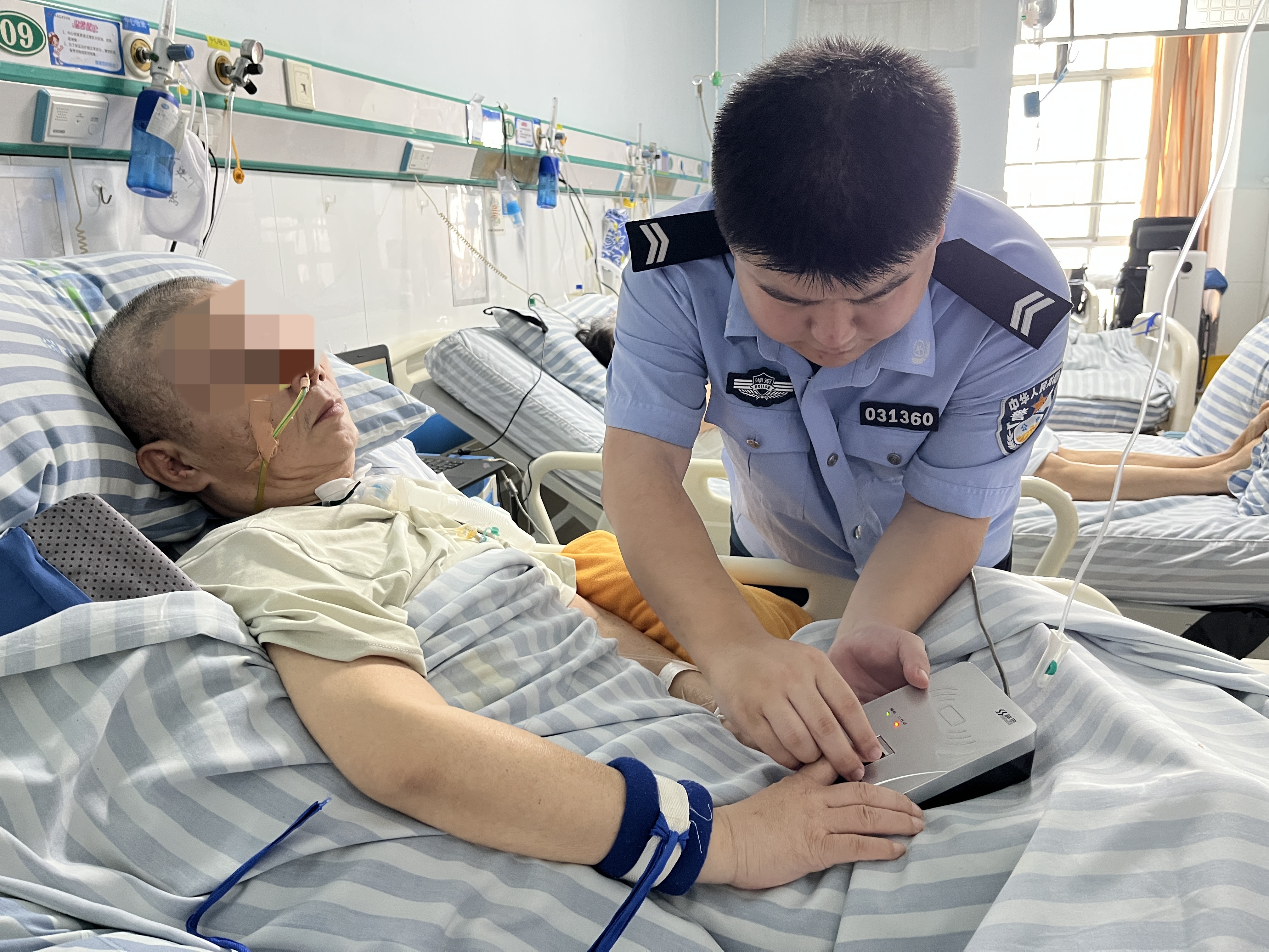 何康是一名企业职工,今年4月份,他突然出现意识障碍、呕吐等情况,被紧急送到医院接受治疗,头部接受了手术。9月16日,何康74岁的母亲向白石港社区居委会求助,反映何康的身份证有效期限到今年9月底止,将影响住院手续办理、享受医保政策等。社区网格长将情况向社区民警进行了反映,为何康申请上门办证服务。图为民警在病房为何康采集指纹。