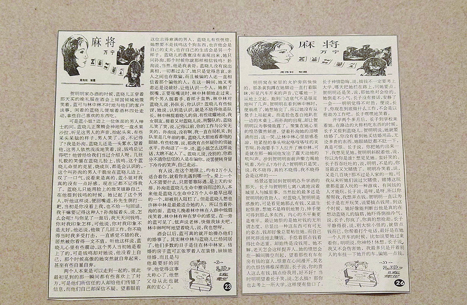 偶尔翻到从前的剪报本,看着粘贴着的《麻将》小说连载,赫然发现,那个四坨上方赫然写着万宁二字。可眼前的万宁,身形窈窕、笑容可掬、明眸皓齿、长发飘飘,这哪里是麻玉帝或麻王母,明明是麻仙子嘛!