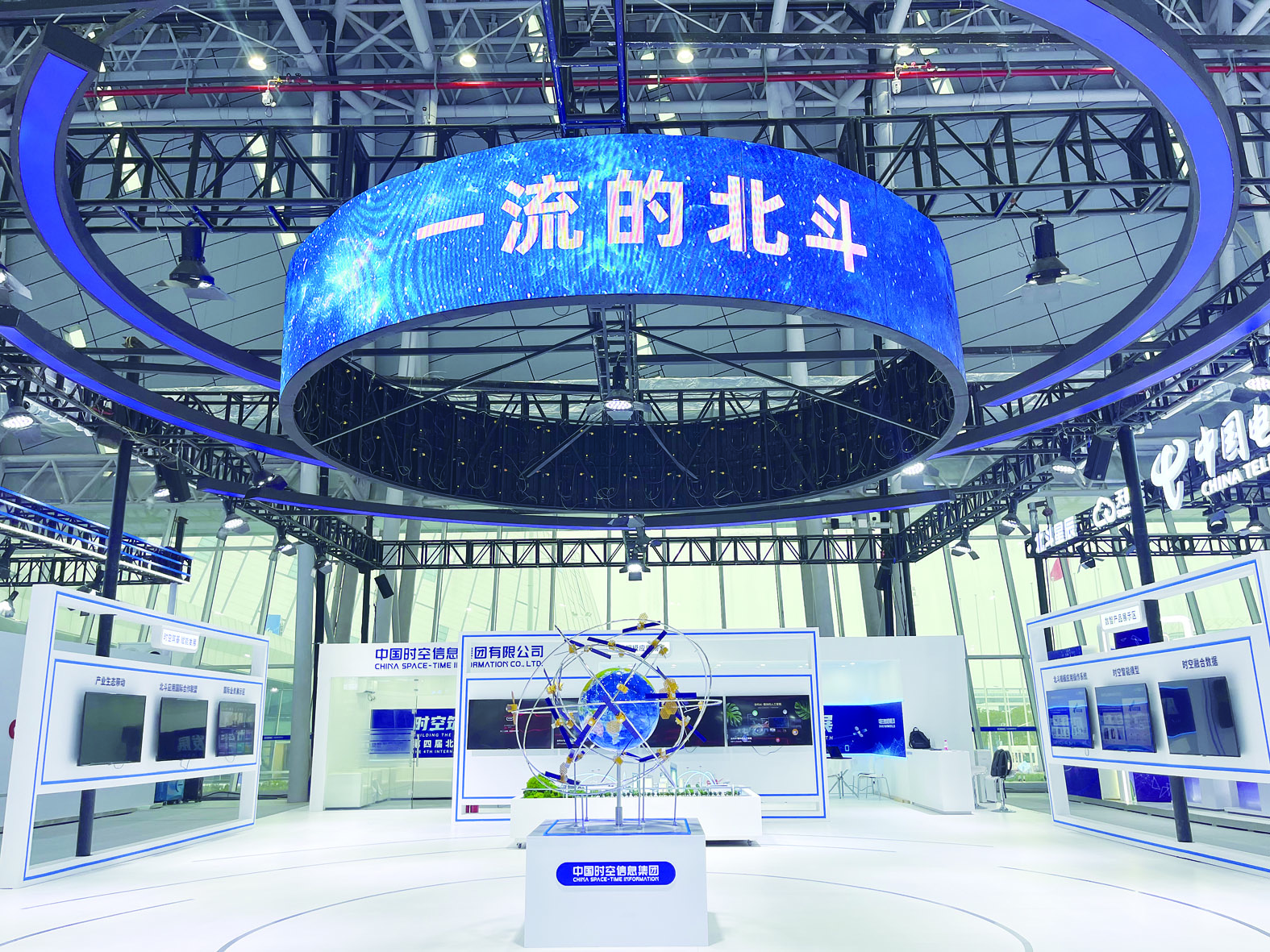 此次参展企业共有112家,其中不乏中国时空、中国电信、高德地图、华大北斗、丰翼无人机等国内头部、重点北斗应用企业,展示产品有无人机、无人车、人形机器人、卫星、北斗应用芯片等。在北斗星通展厅,工作人员正在摆放最新研发出的北斗应用芯片,最小的一片仅米粒大小。展厅工作人员告诉记者,“这些芯片应用在车载导航上,即使在隧道、地下车库也能保持100%连续定位。”
