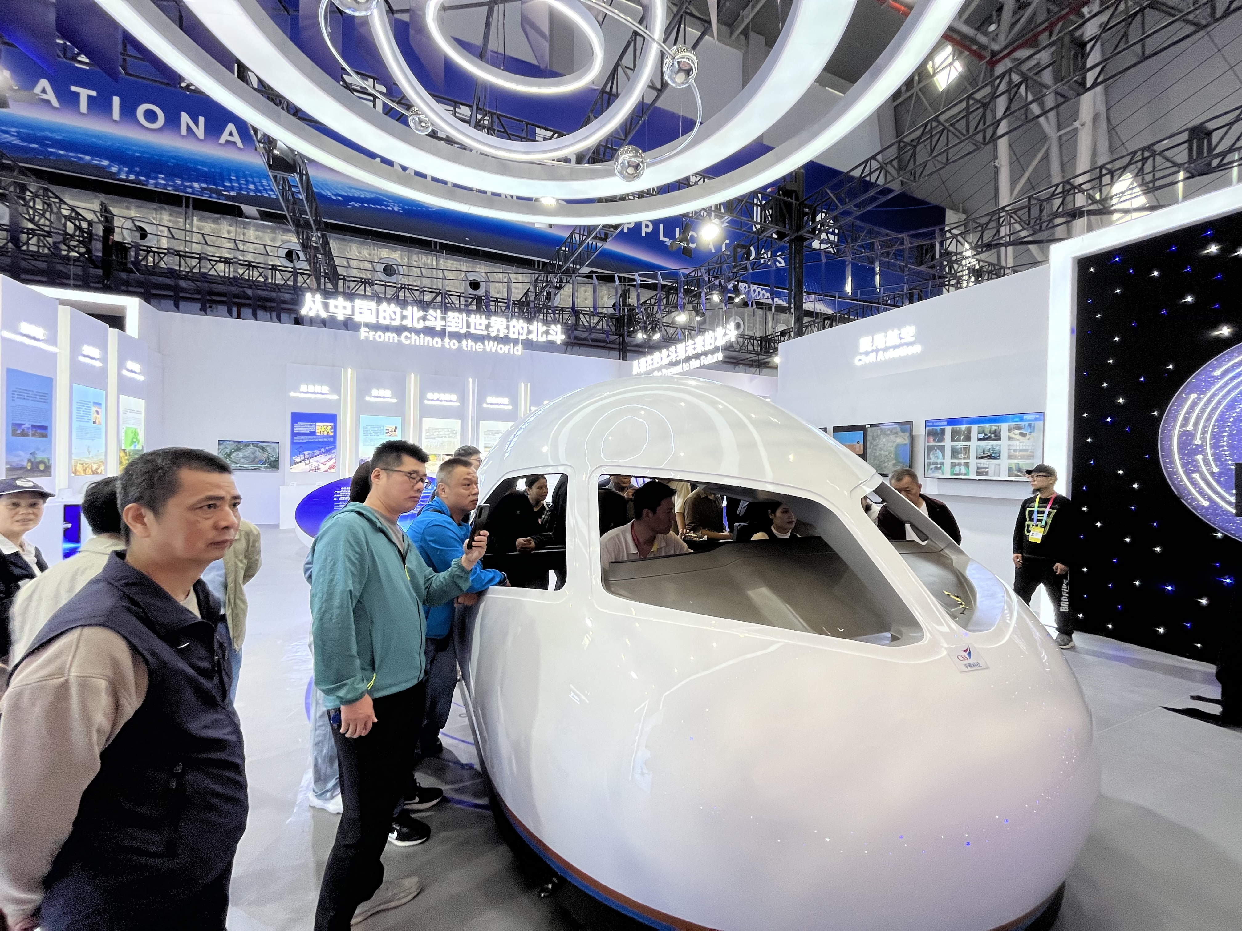 在大国重器展区,市民们围着长征三号乙运载火箭、复兴号动车组、奋斗者号深潜器等近60件高端装备模型打卡拍照。这些大国重器全部以实物模型形式展示,全面展现了北斗在陆海空天全领域的融合应用。“没想到北斗已经应用到这么多大国重器上,带孩子来参观既能开阔眼界,也能培养对科学的兴趣。”一位带着孩子前来参观的市民表示。