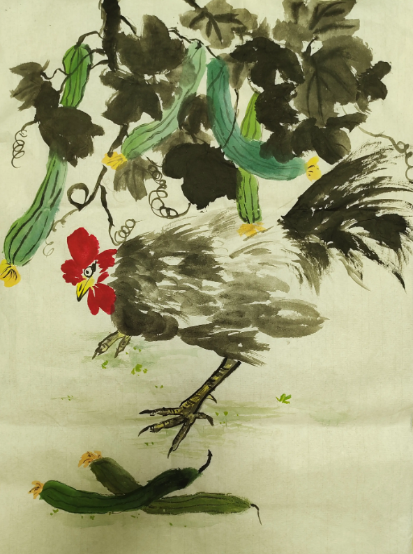 鸡戏瓜藤间