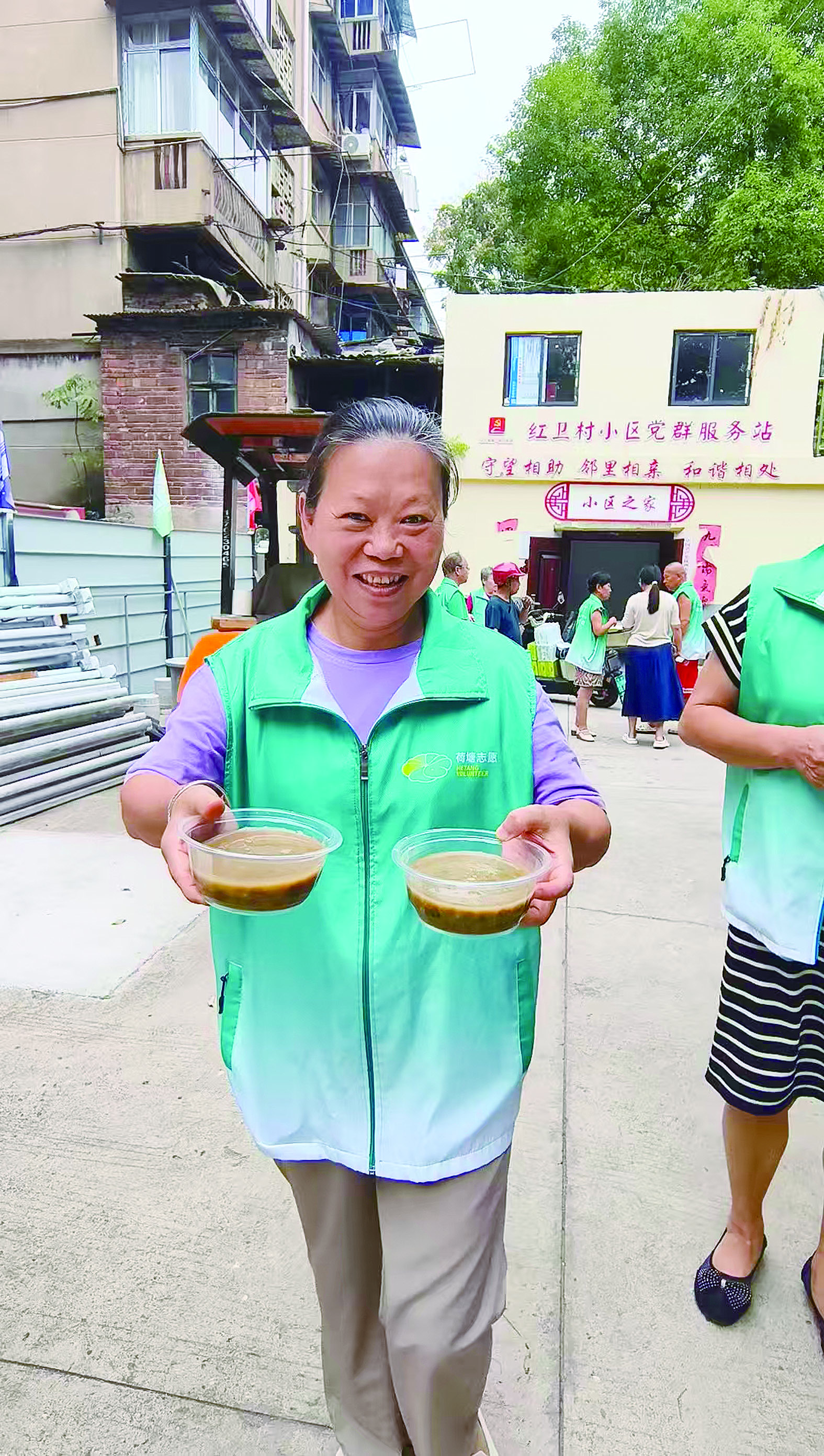 小区居民端来绿豆汤。记者/廖智勇 摄