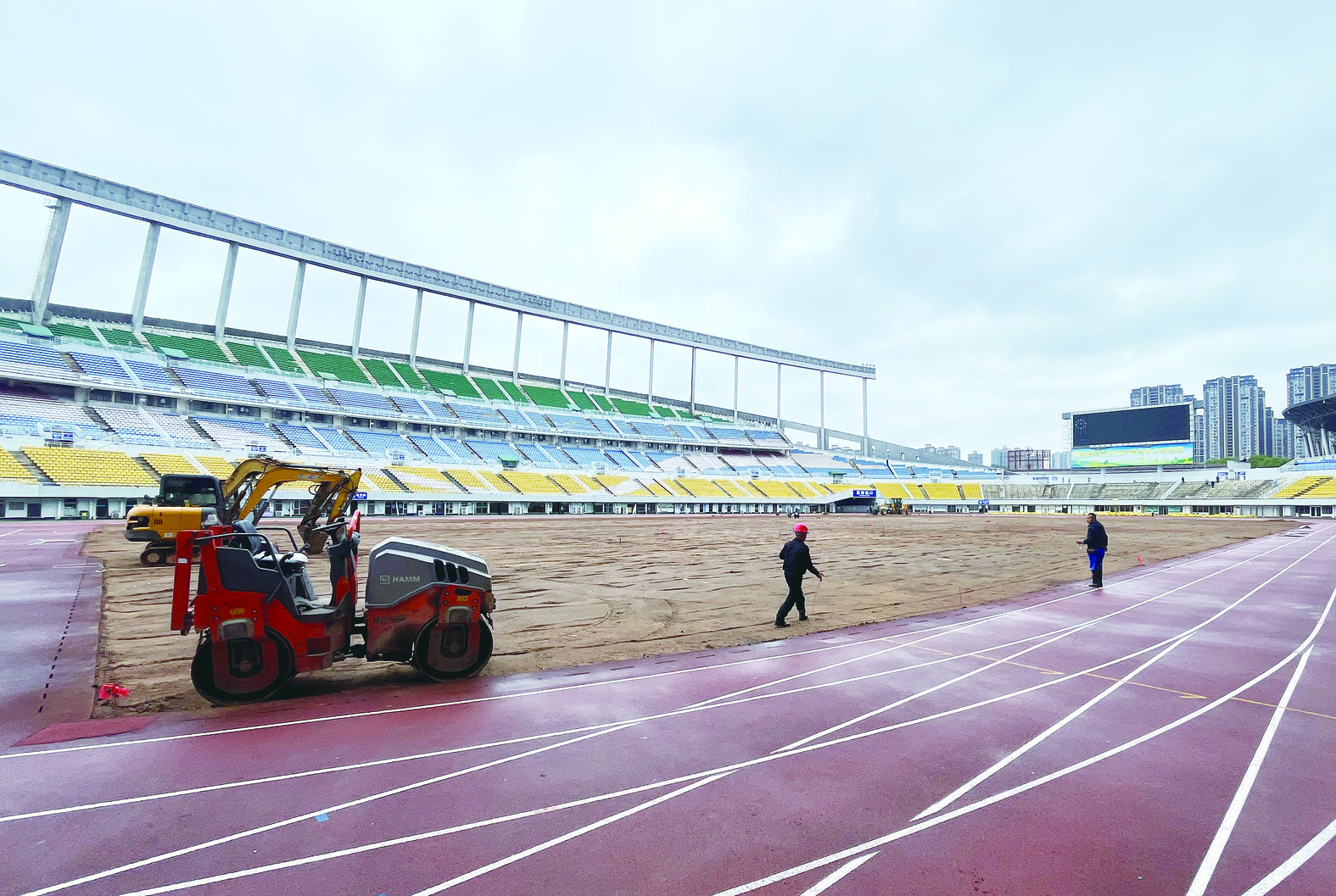 9月24日,株洲市体育中心足球场,施工人员在进行球场改造、看台座椅更换等工程。