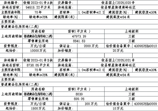 攸储2023-01号A块:(一)规划建设要求:严格按照攸县自然资源局批准的规划条件《关于攸储2023-01号地块的规划条件》(攸自然资条〔2025〕7号)进行建设。(二)成交价款缴纳期限:余款在成交之日起60日内交齐,逾期则严格按照《土地出让金管理办法》规定依法收缴违约金。(三)宗地移交条件:宗地由土地储备中心按现状移交。①交地、腾地中涉及的有关村组矛盾纠纷由土地储备中心商联星街道办事处负责解决。②宗地红线范围内的土地由征地协调服务中心依法征拆补偿到位。③宗地红线范围内的土地平整及相关建设由竞得人自行负责。(四)成交价款缴纳期限:成交之日起60日内交齐;交地时间:交齐价款后60日内交地;动工时间:交地之日起60日内动工;竣工时间:动工之日起两年内竣工。(五)竞买人范围为:中华人民共和国境内外的法人和其他组织。