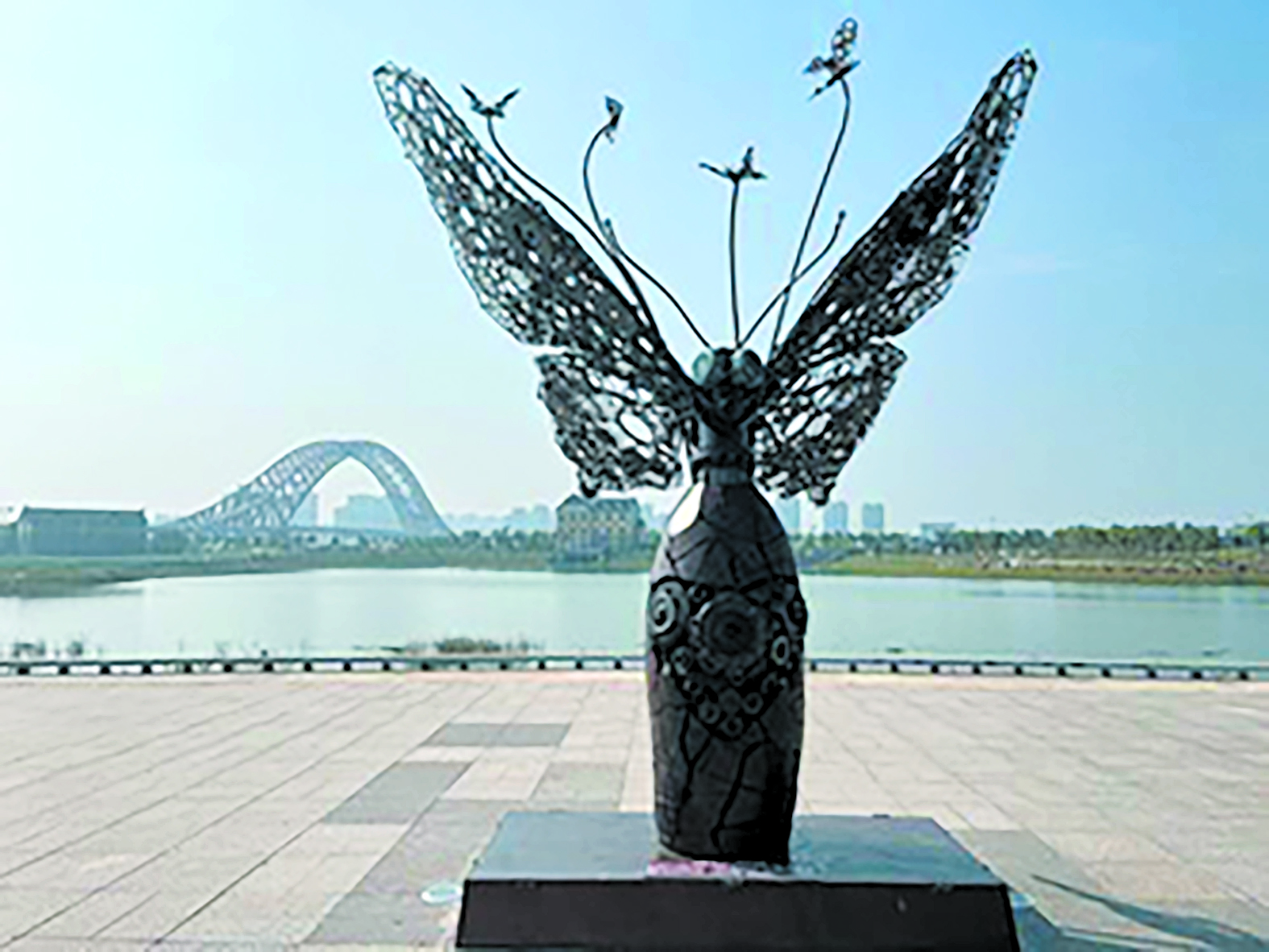近日,清水塘城市公园新添了一座采用蝴蝶造型的铁艺雕塑,名为《蝶变·清水塘》。该雕塑作品由1256个工业废旧零件材料组成,有来自“株冶”厂的铅锌阀门,也有来自“株化”厂的硫酸储罐,还包括来自“智成”厂的合成氨管道和“湘氮”厂的尿素反应器等。该作品寓意这片土地完成了从烟囱林立的“工业锈带”向生机勃勃的“城市绿肺”的蜕变。
