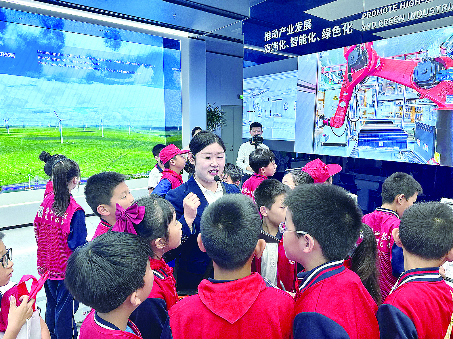 孩子们在一张展示中国中车十年成就的大展板前驻足,了解到我们国家的高铁等“大国重器”有多么了不起。