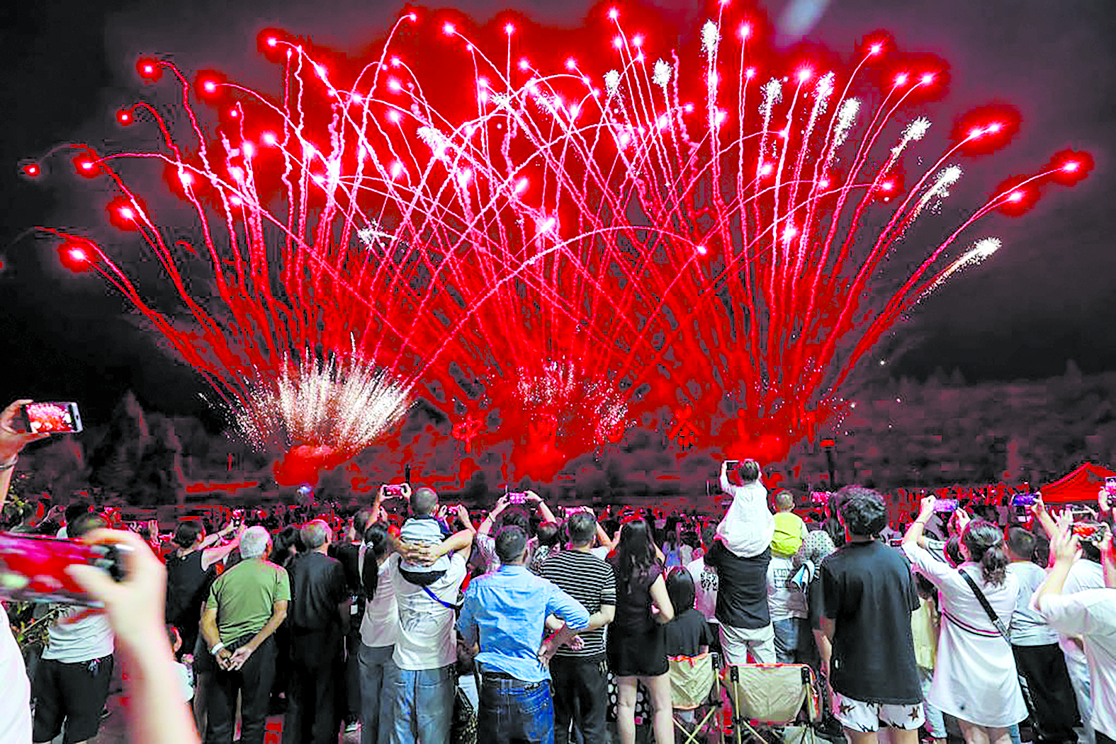10月3日晚,游客在贵州省铜仁市玉屏侗族自治县茶花泉景区观看烟花。新华社/胡攀学 摄