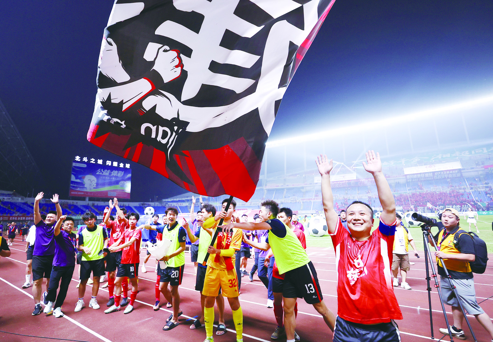 “湘超”株洲主场首秀结束后,队员们向观众挥手致意。 株洲日报全媒体记者/谢慧 摄