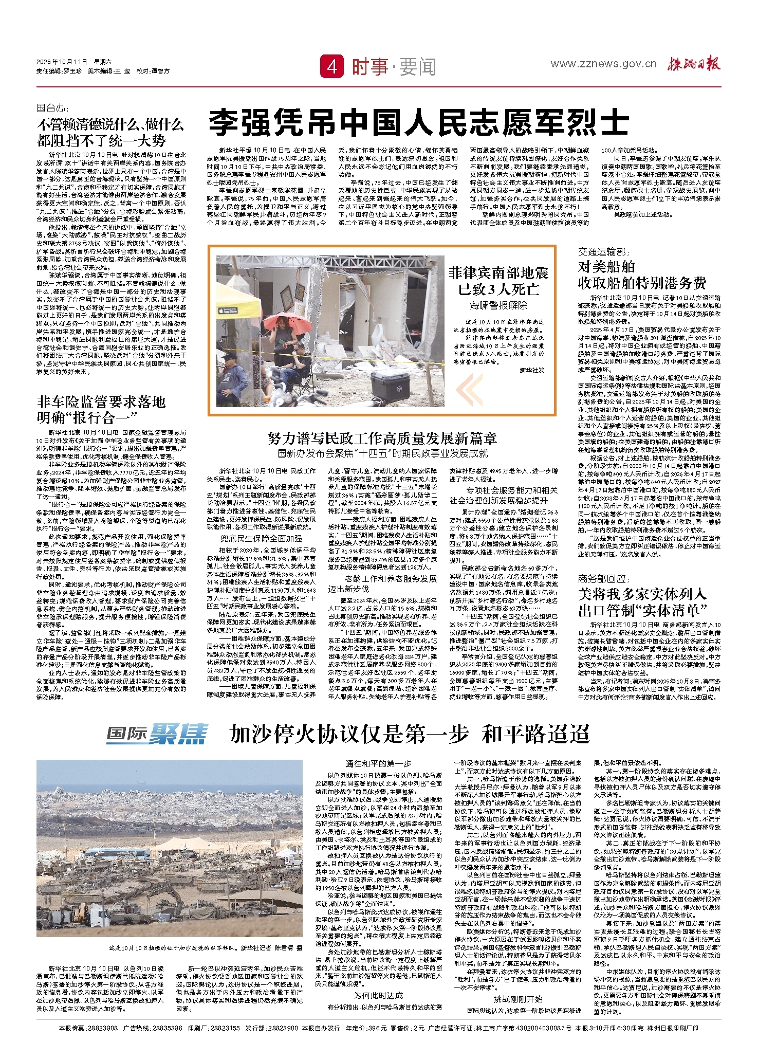 新华社北京10月10日电 以色列10日凌晨宣布,已批准与巴勒斯坦伊斯兰抵抗运动(哈马斯)签署的加沙停火第一阶段协议。从各方释放的信息看,协议内容包括加沙立即停火、以军在加沙地带后撤、以色列与哈马斯互换被扣押人员以及人道主义物资进入加沙等。