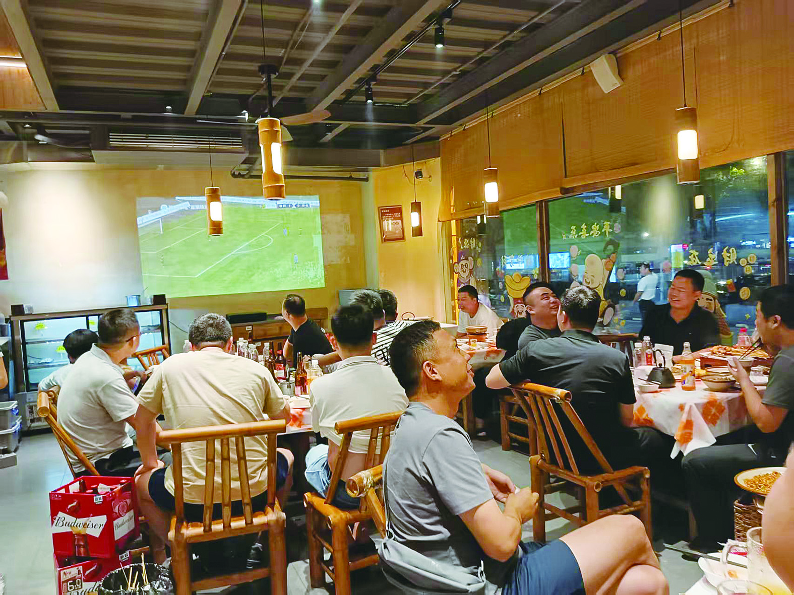 靠姐烧烤店内,同样是人声鼎沸。食客们吃着烤串喝着啤酒,目光紧随着墙上电视机中足球的轨迹移动,且看且吃,好不快活。面对不断进店的客流,身穿株洲足球队红色队服的前台服务人员只能不断道歉说:“对不起,估计等位还需要1个小时。”
