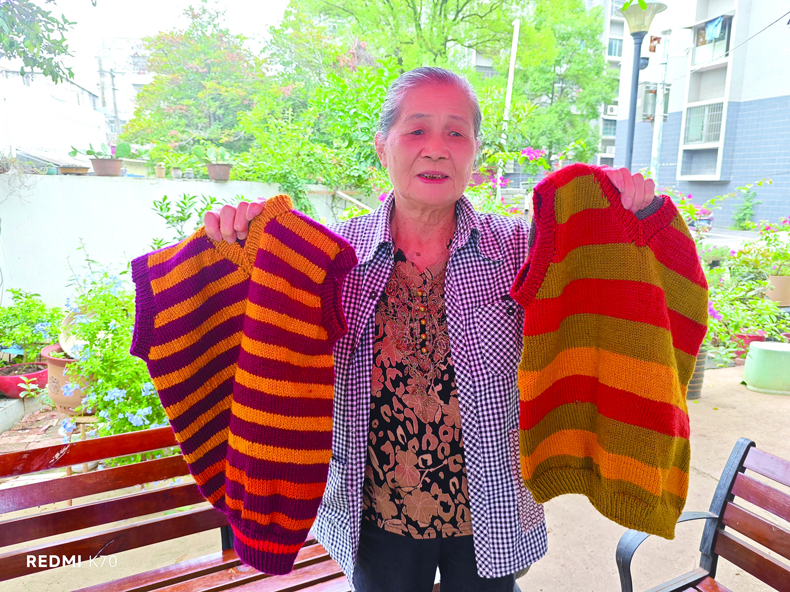 这些毛线颜色各异来自不同的家庭。小区居民自发形成的“毛线接力”,已成为一道亮丽的风景线。她将邻居送来的各色毛线戏称为“百家线”,钩织的毛衣则是“百家衣”。