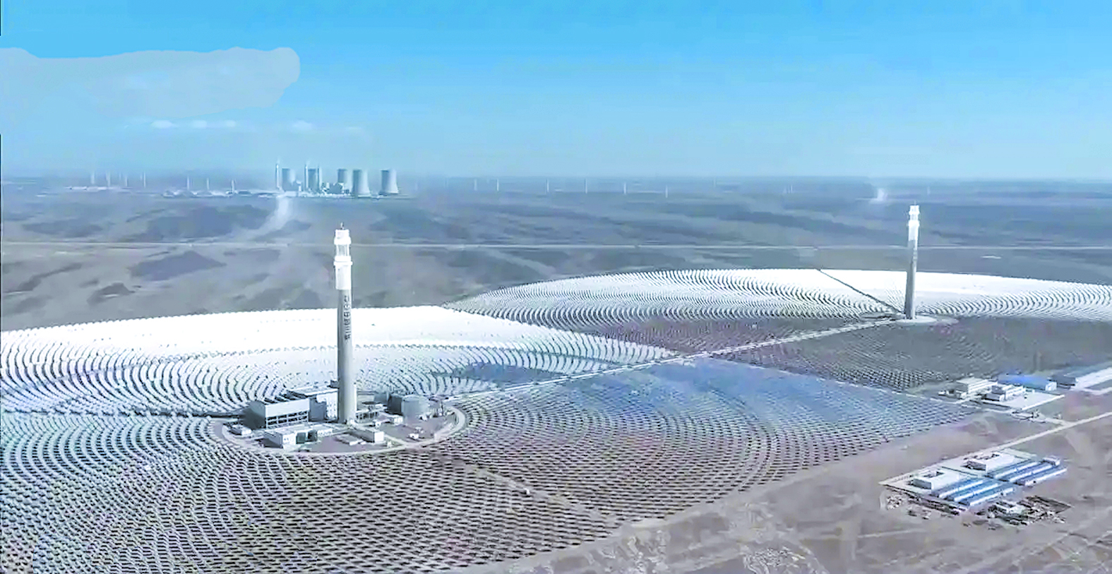 大漠之上,烈日之下,两座约200米高的吸热塔矗立,近2.7万块定日镜泛着银色波光。