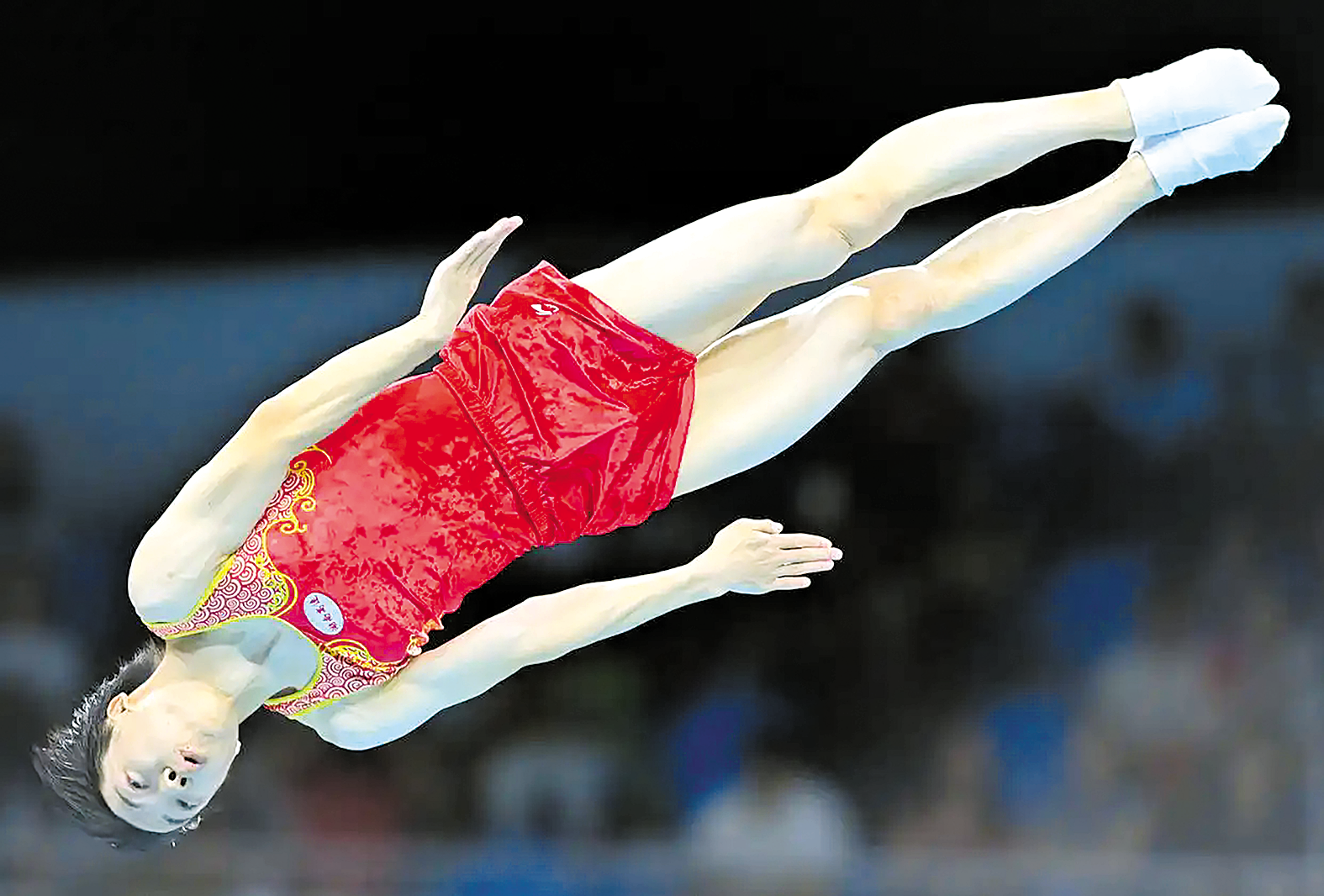 10月12日,第十五届全运会蹦床项目男子网上个人决赛在广州体育馆举行,严浪宇以65.79分夺冠。