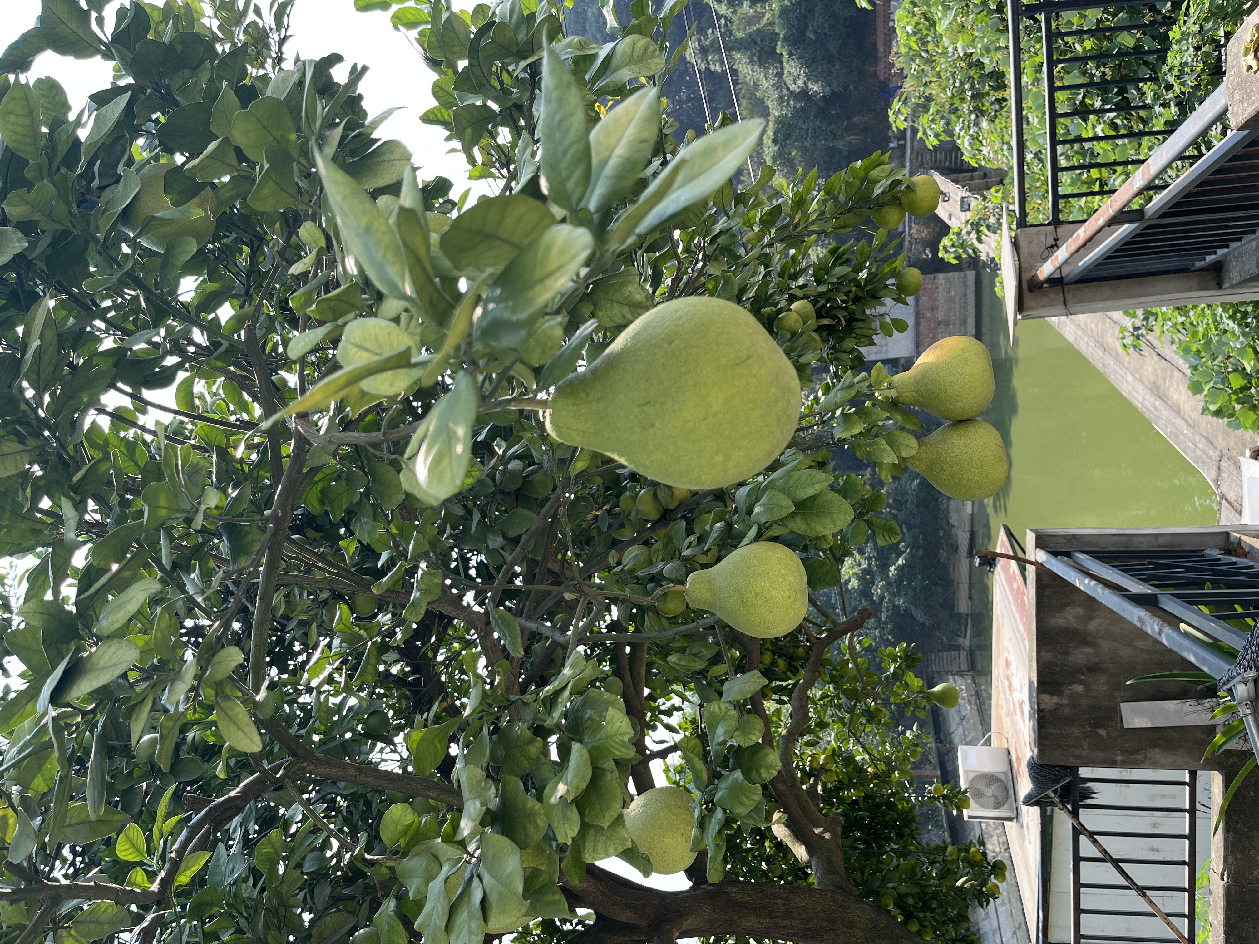 10月11日,在石峰区井龙街道井龙社区,居民言海军嫁接的一棵柚子树上,结有沙田柚、蜜桔、脐橙等6种水果。今年是该树上的6个水果品种首次同树结果。图为居民家的柚子树。