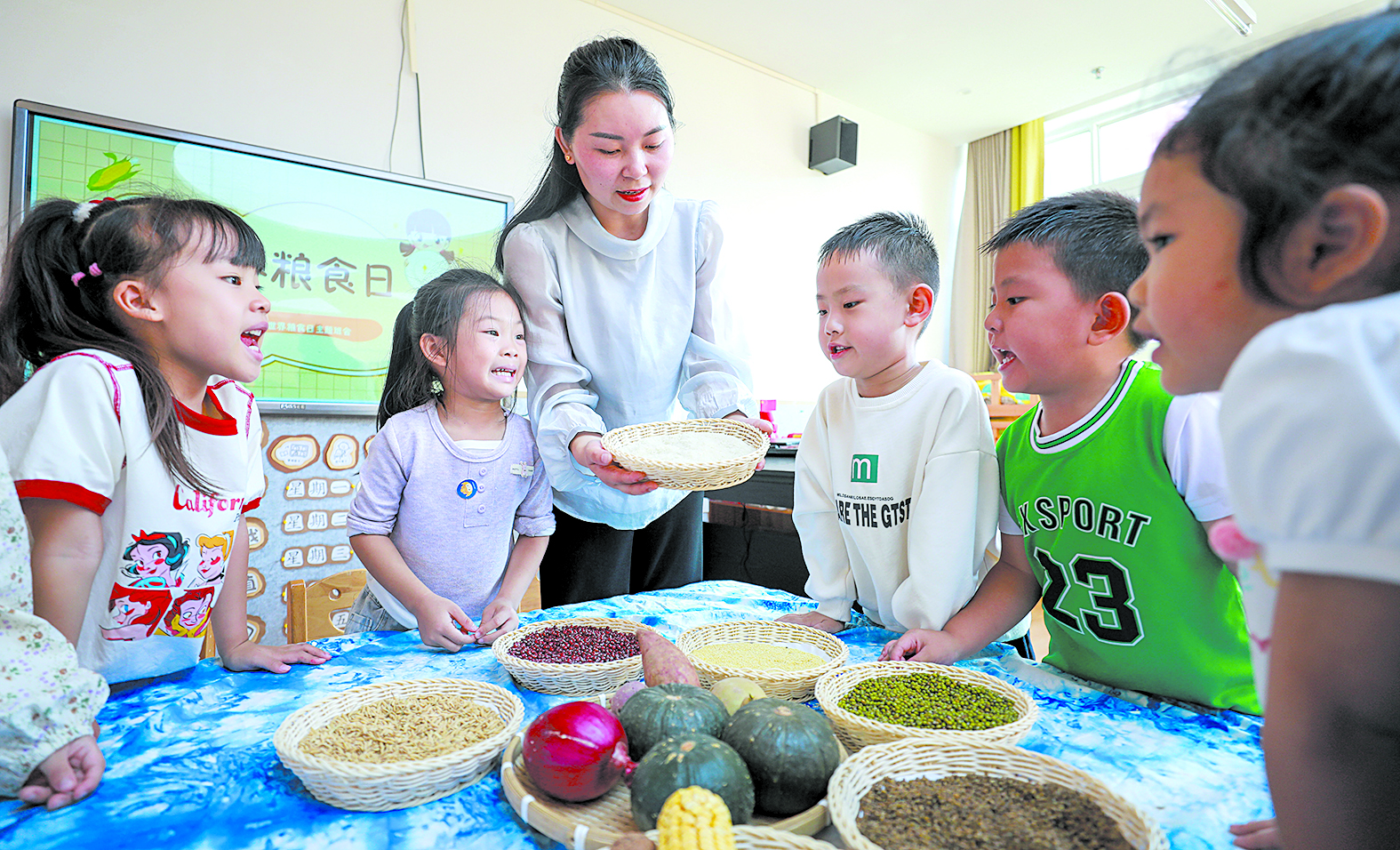 10月16日,贵州省都匀市凤凰幼儿园的老师为小朋友讲解各类粮食知识。 新华社/肖伟 摄