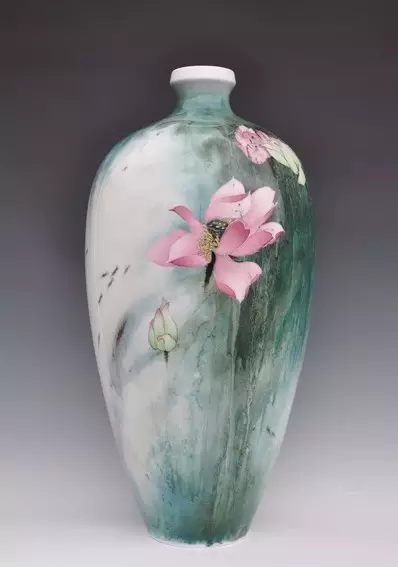 易龙华是渌江河畔陶瓷人,一直在探索如何运用陶瓷工艺表现国画艺术,试着打通国画与陶瓷、艺术与工艺的“任督二脉”。中国画是“画中有诗、诗中有画”,然而画并非“画”出来,而是“写”出来的,故谓之“写意”。何谓“意”?只可意会,不可言传。如何“写”?八仙过海,各显神通。易龙华服膺谢赫“六法”,非常注重作品之气韵。在陶瓷上,总想利用高温釉下彩的工艺特点,表现生动气韵。为此,在写意山水方面做了许多尝试,几年前开始探索釉下泼彩。确实,一个“泼”字何等写意,一泼入纸气韵自生,绝非有意刻画能为之。陶瓷这一艺术载体,也给了他突破纸上泼彩局限的可能性。但是,将这一艺术表现形式引入釉下彩瓷,谈何容易?