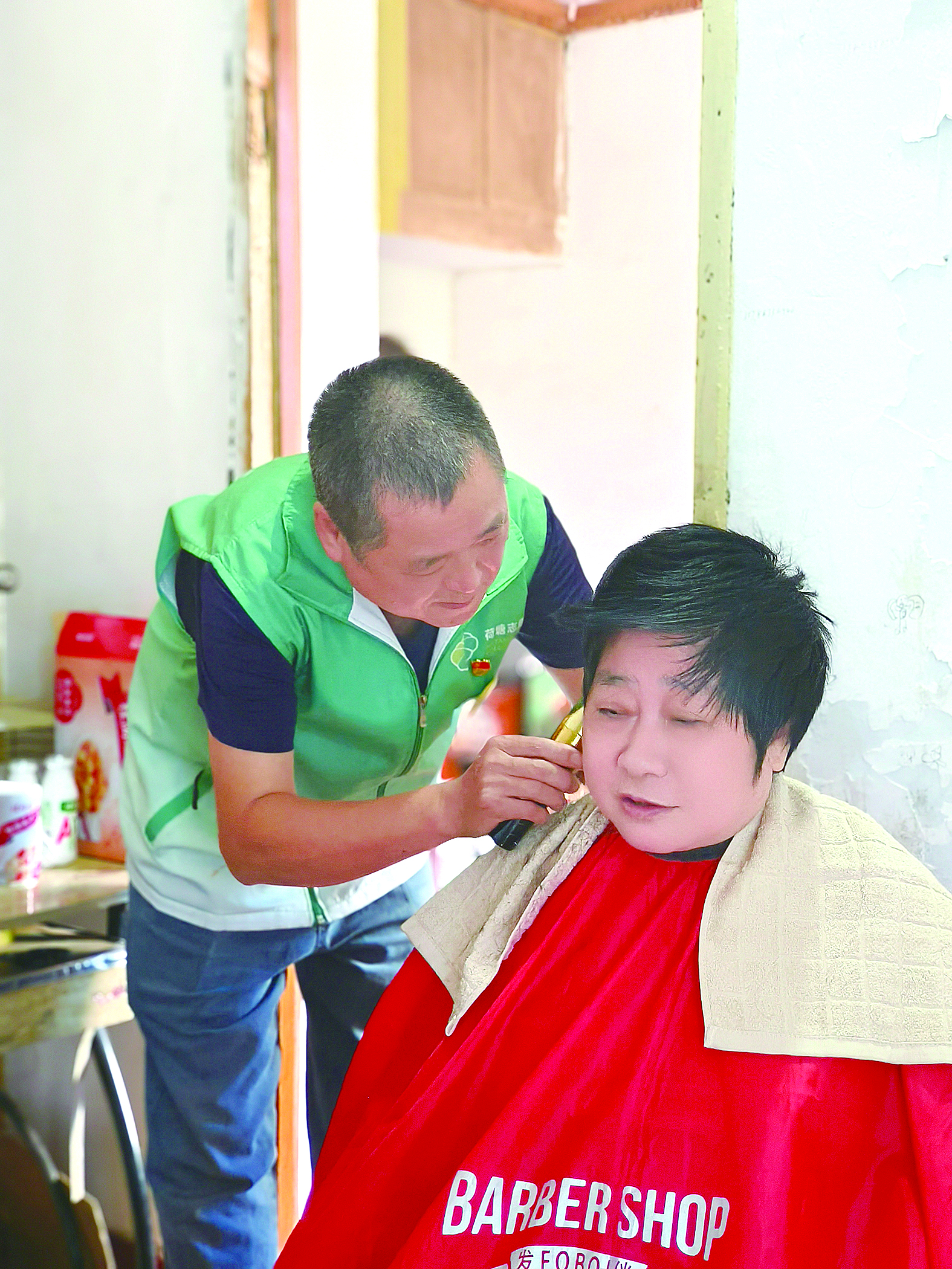 戴义胜为瘫痪在床的石福英义剪。 记者廖智勇 摄
